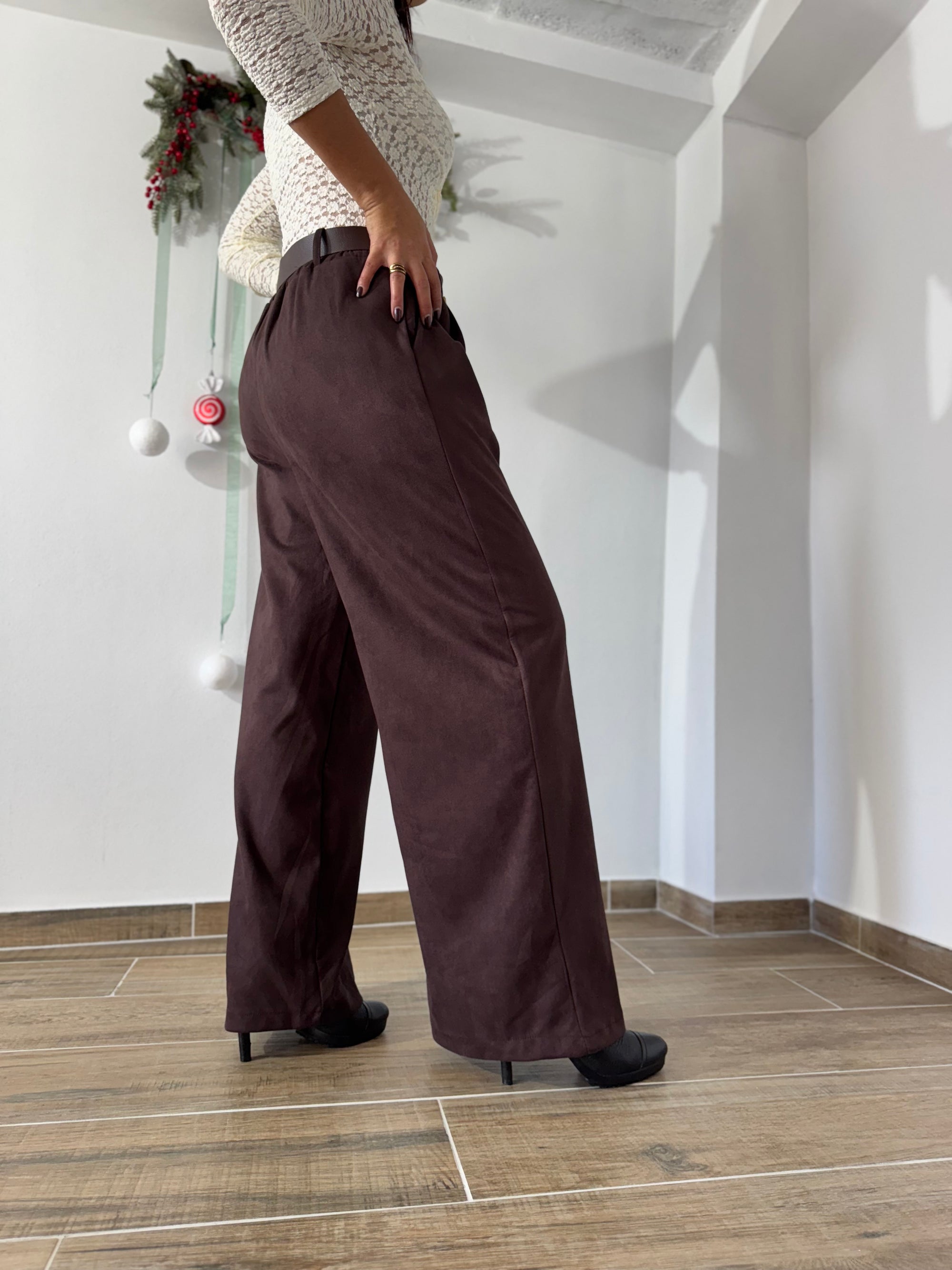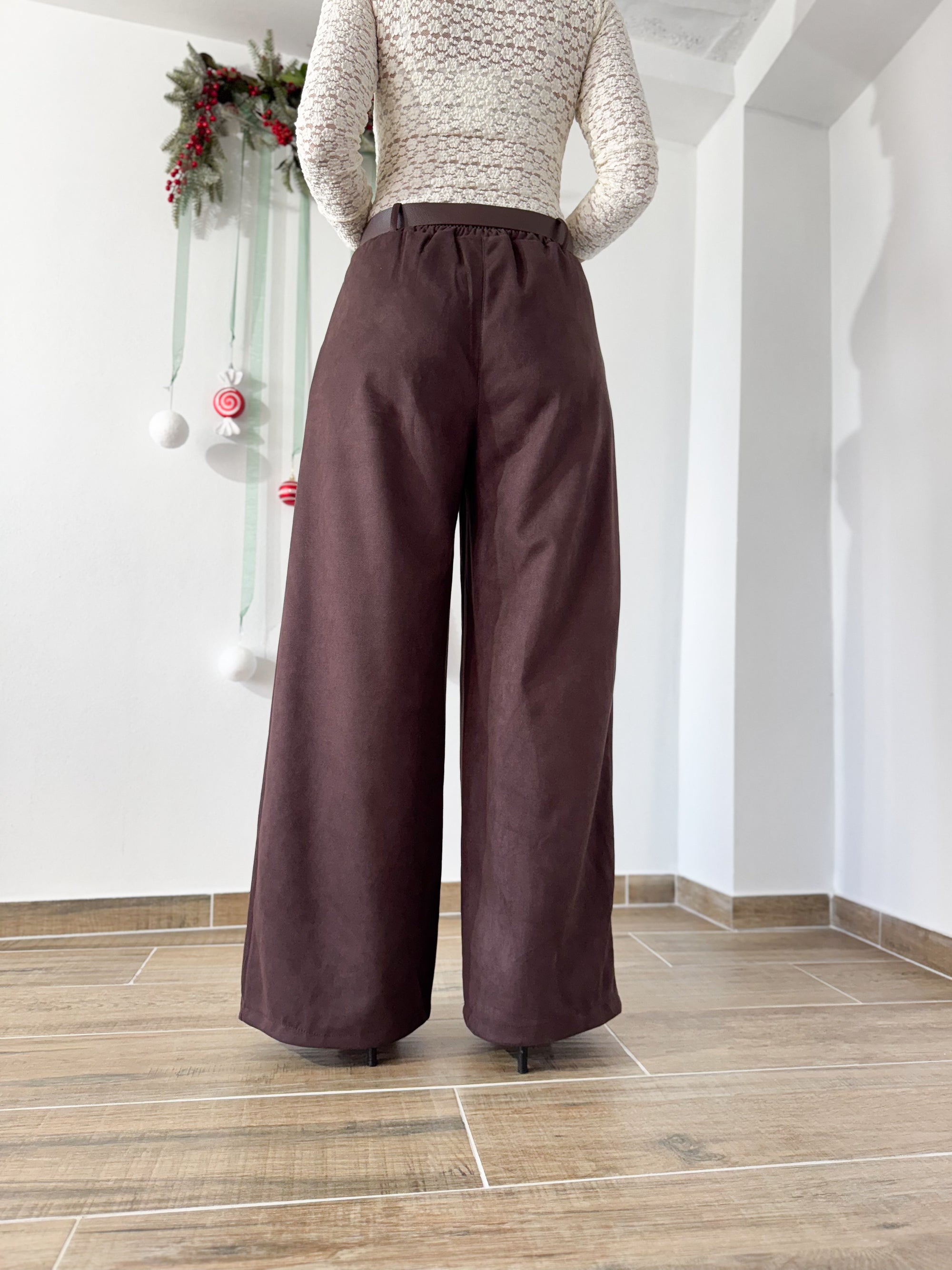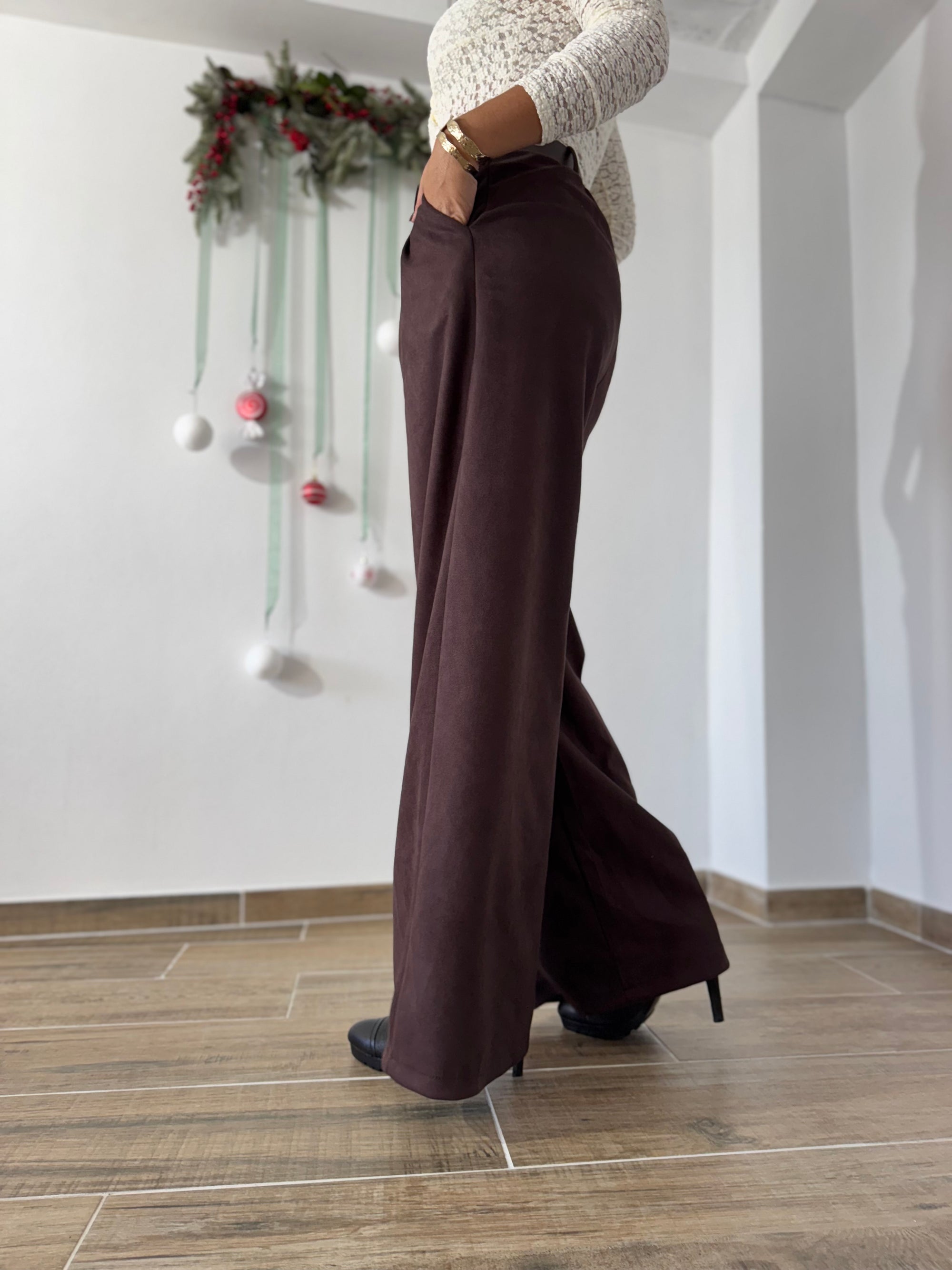Modelo wide leg em tom chocolate profundo, com cintura subida e pinças frontais que dão estrutura e elegância. O tecido tem toque suave e ligeiro efeito camurça, trazendo sofisticação extra.