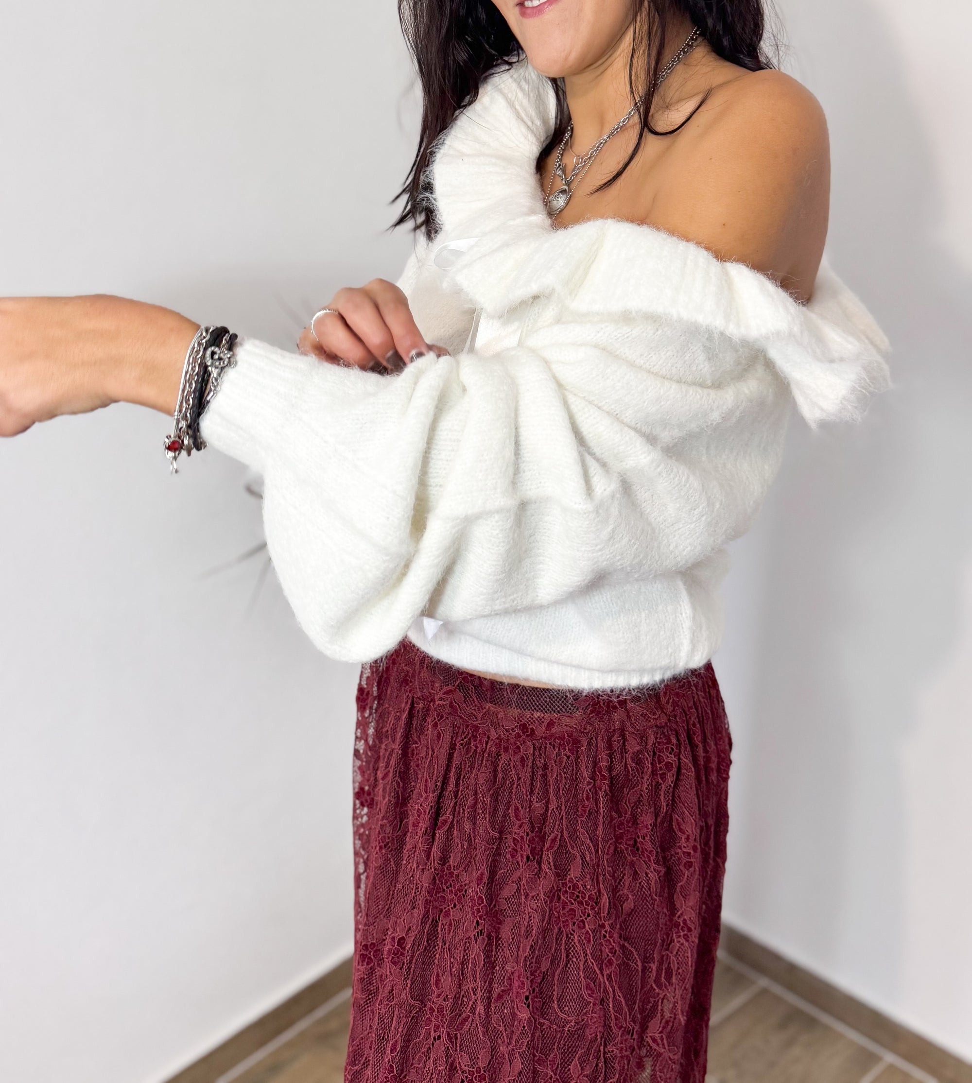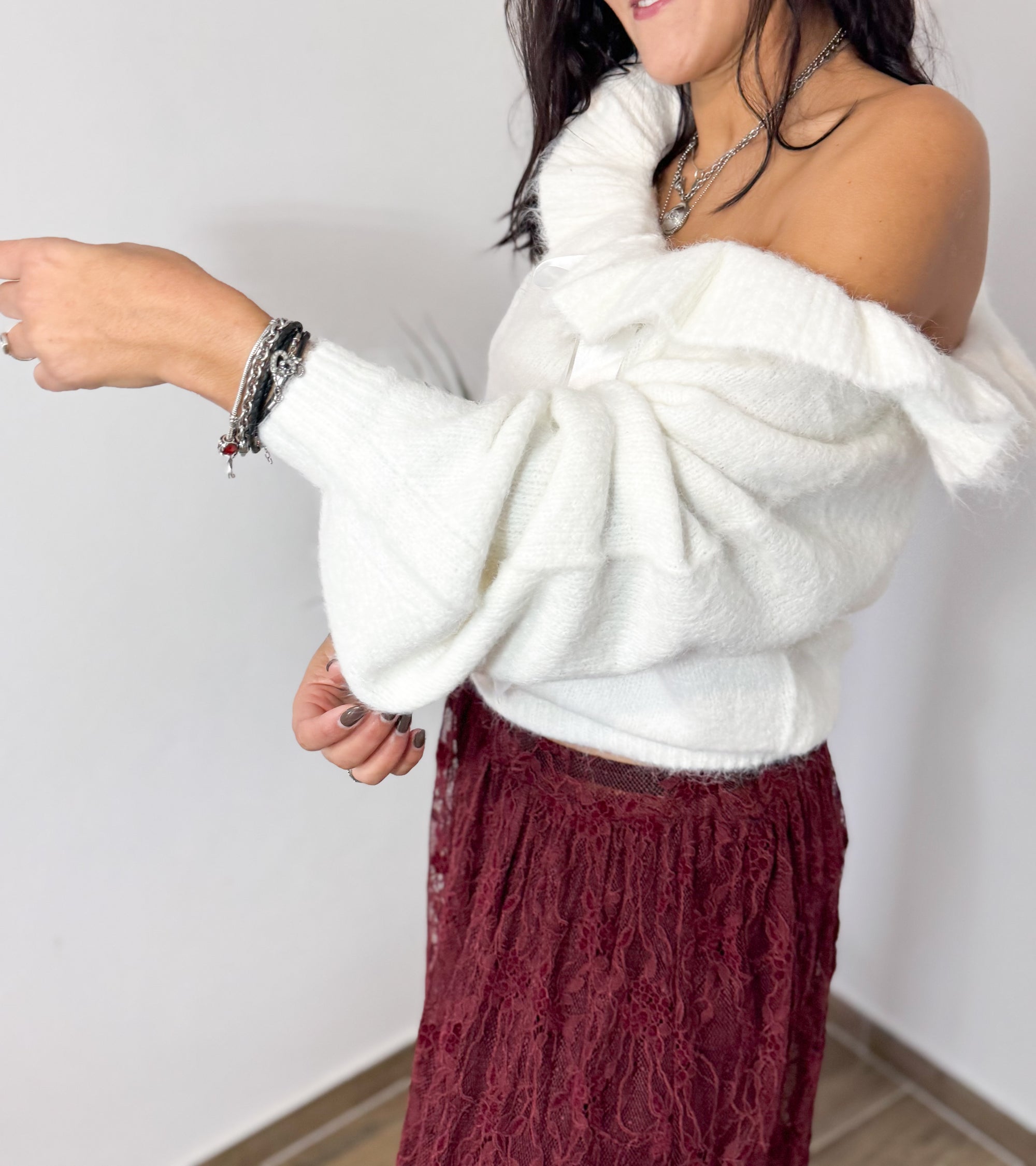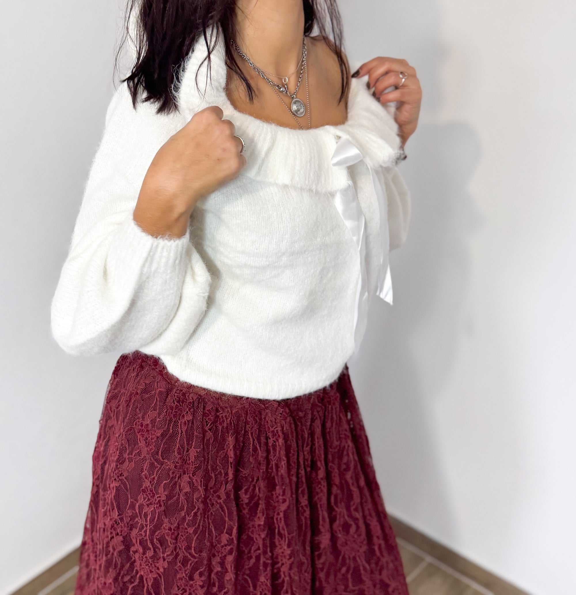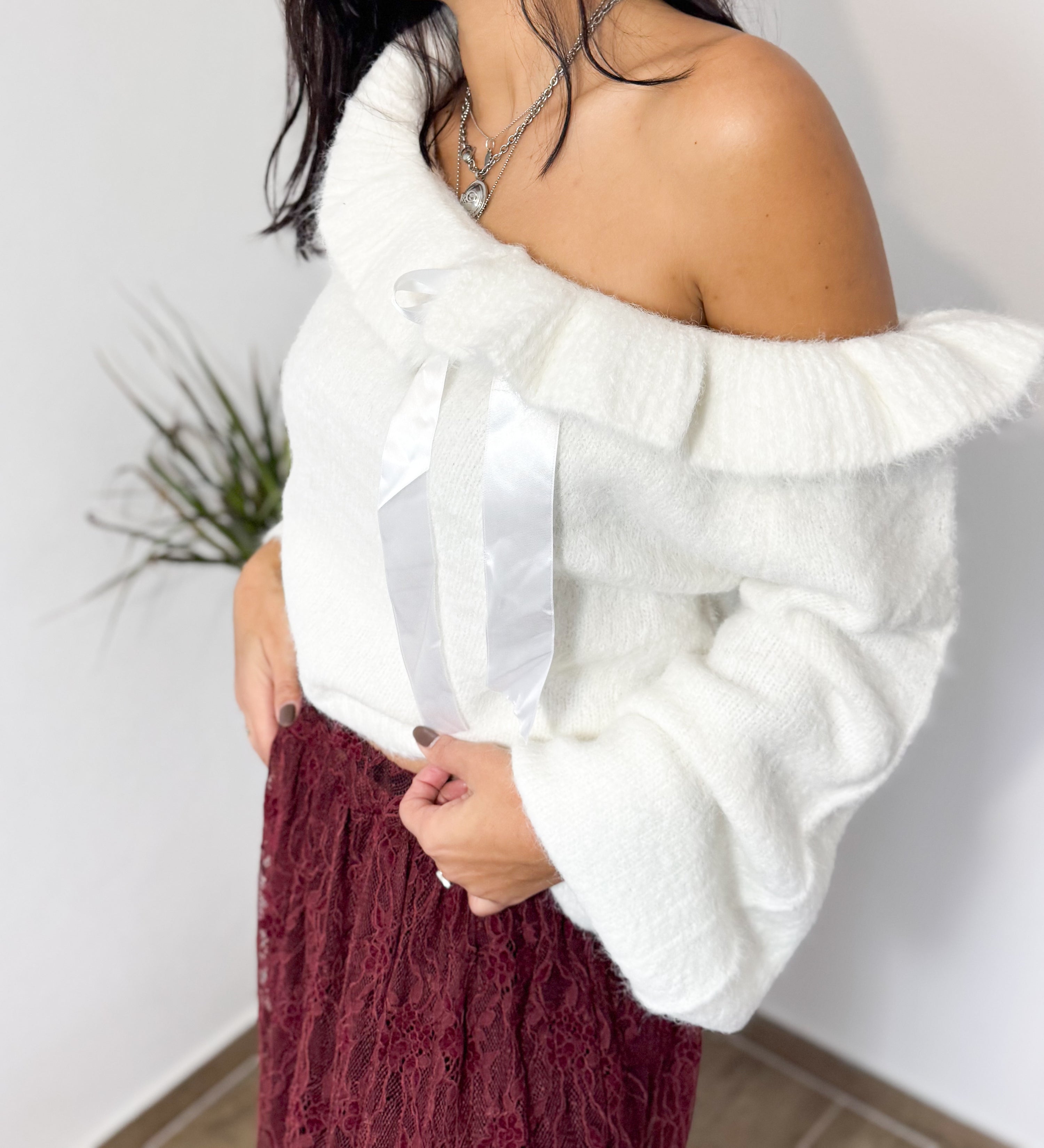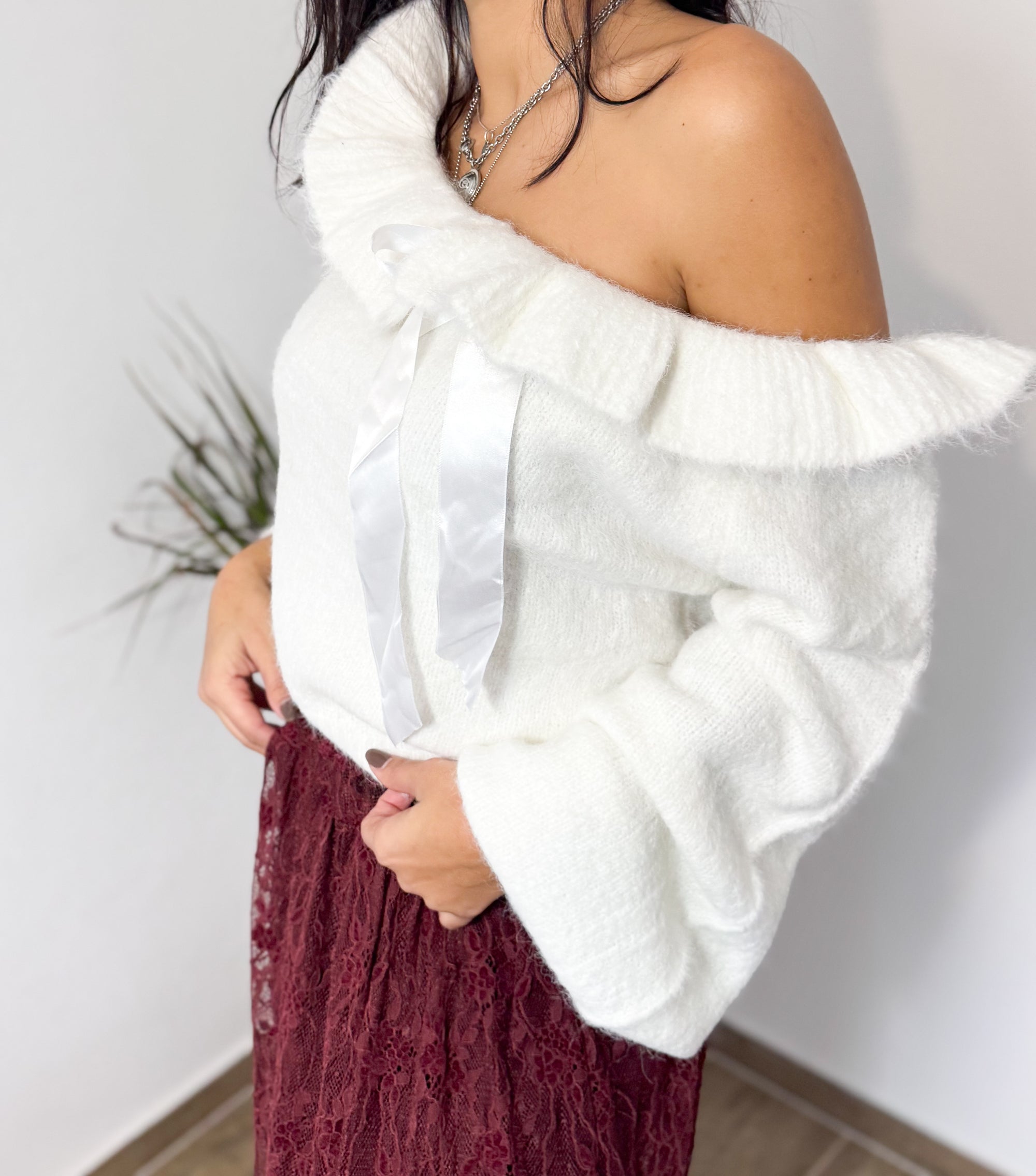 Camisola de malha macia, com decote ajustável com laço em fita acetinada. Um modelo feminino e elegante, perfeito para looks românticos com um toque sofisticado.