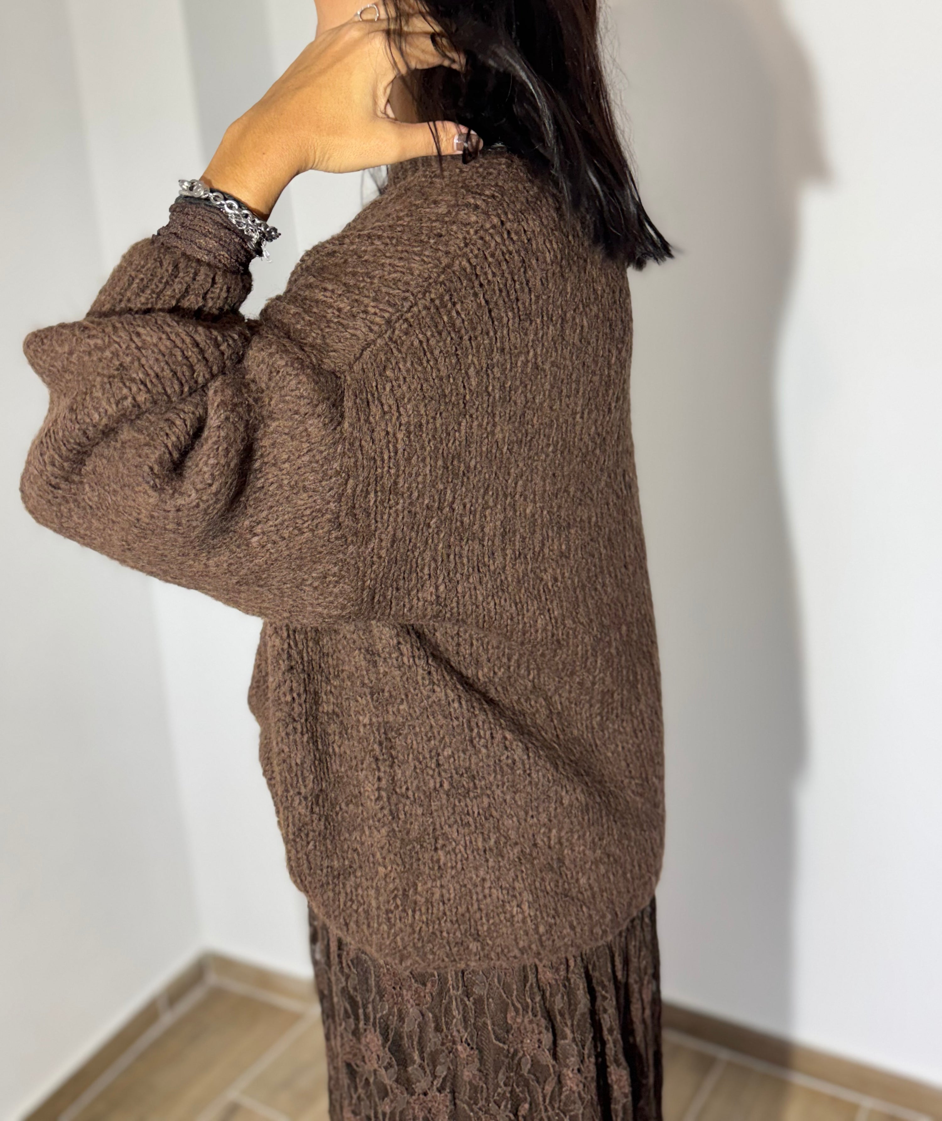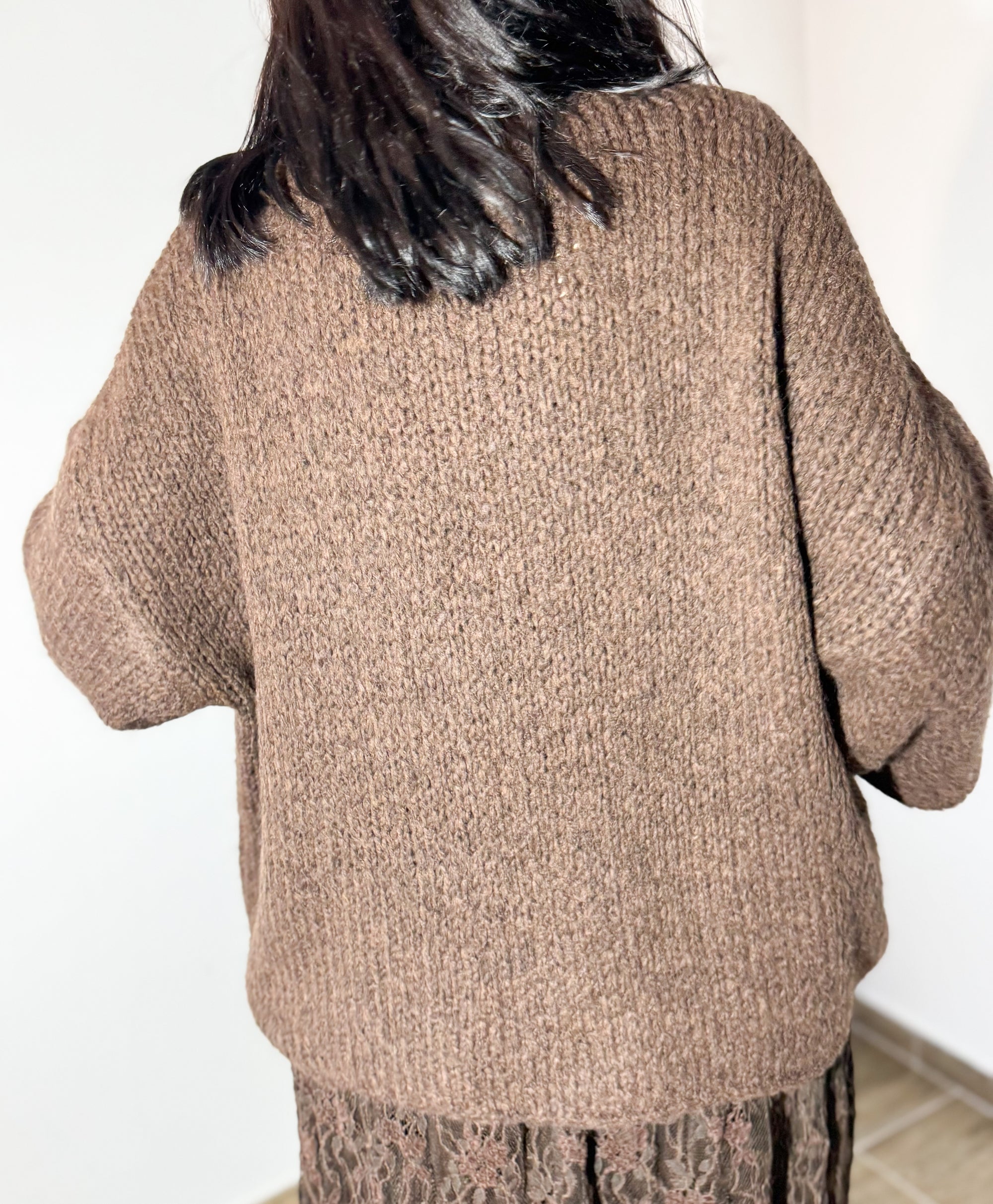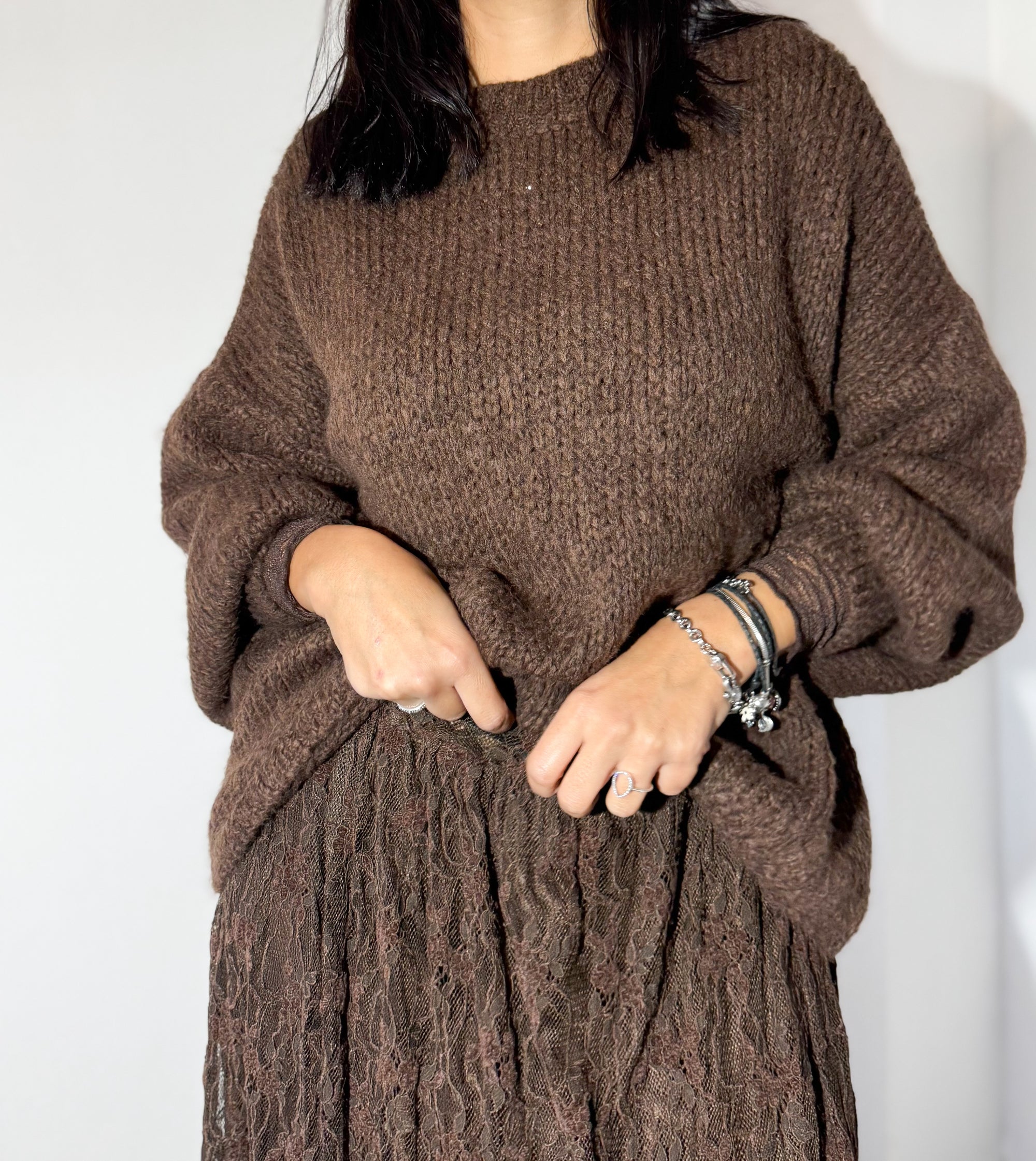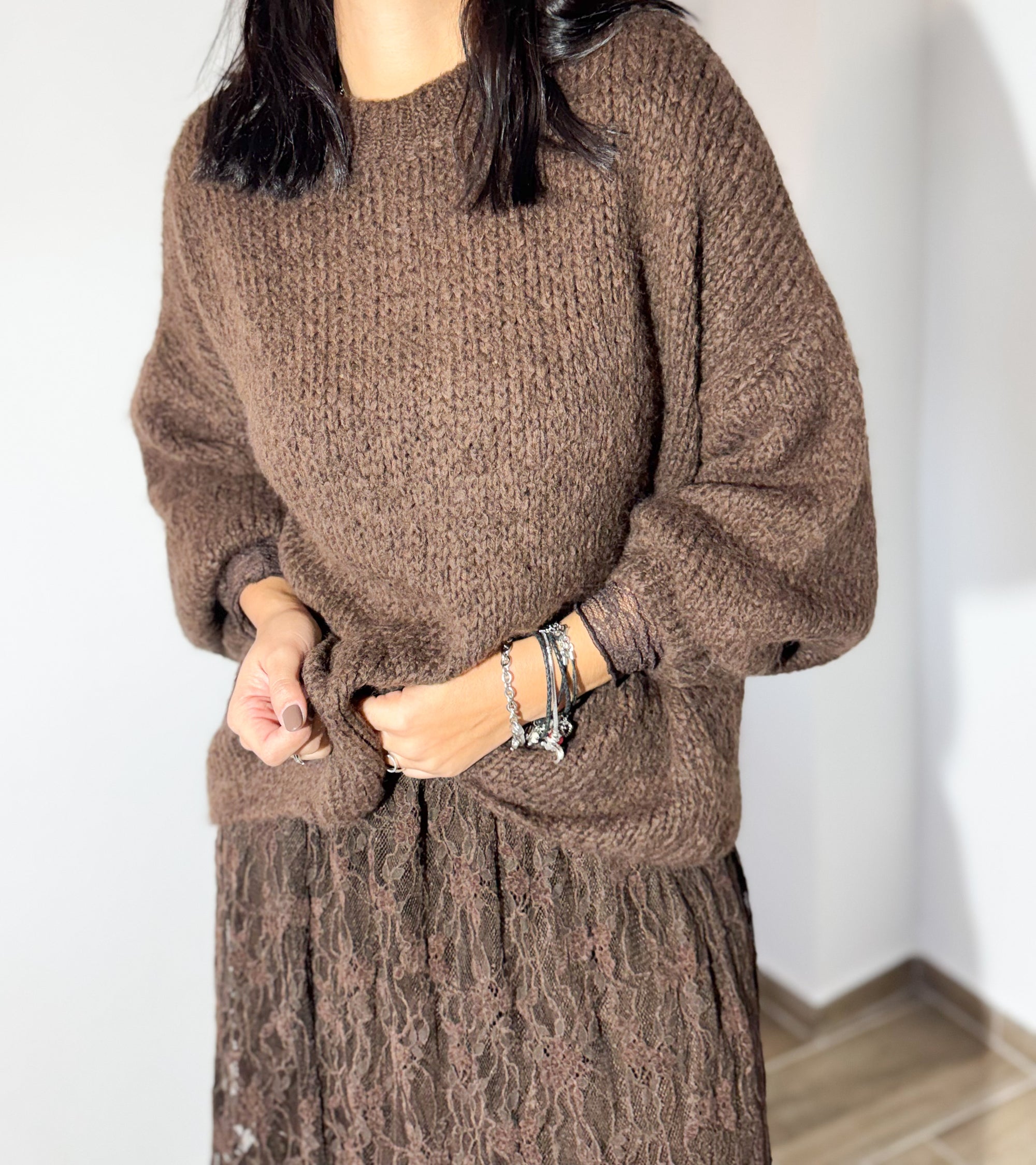 A malha chocolate, de toque macio e corte descontraído, combina de forma perfeita com a saia rendada no mesmo tom, criando um visual elegante, feminino e super harmonioso. A mistura de texturas dá profundidade ao outfit, mantendo o conforto sem perder sofisticação.