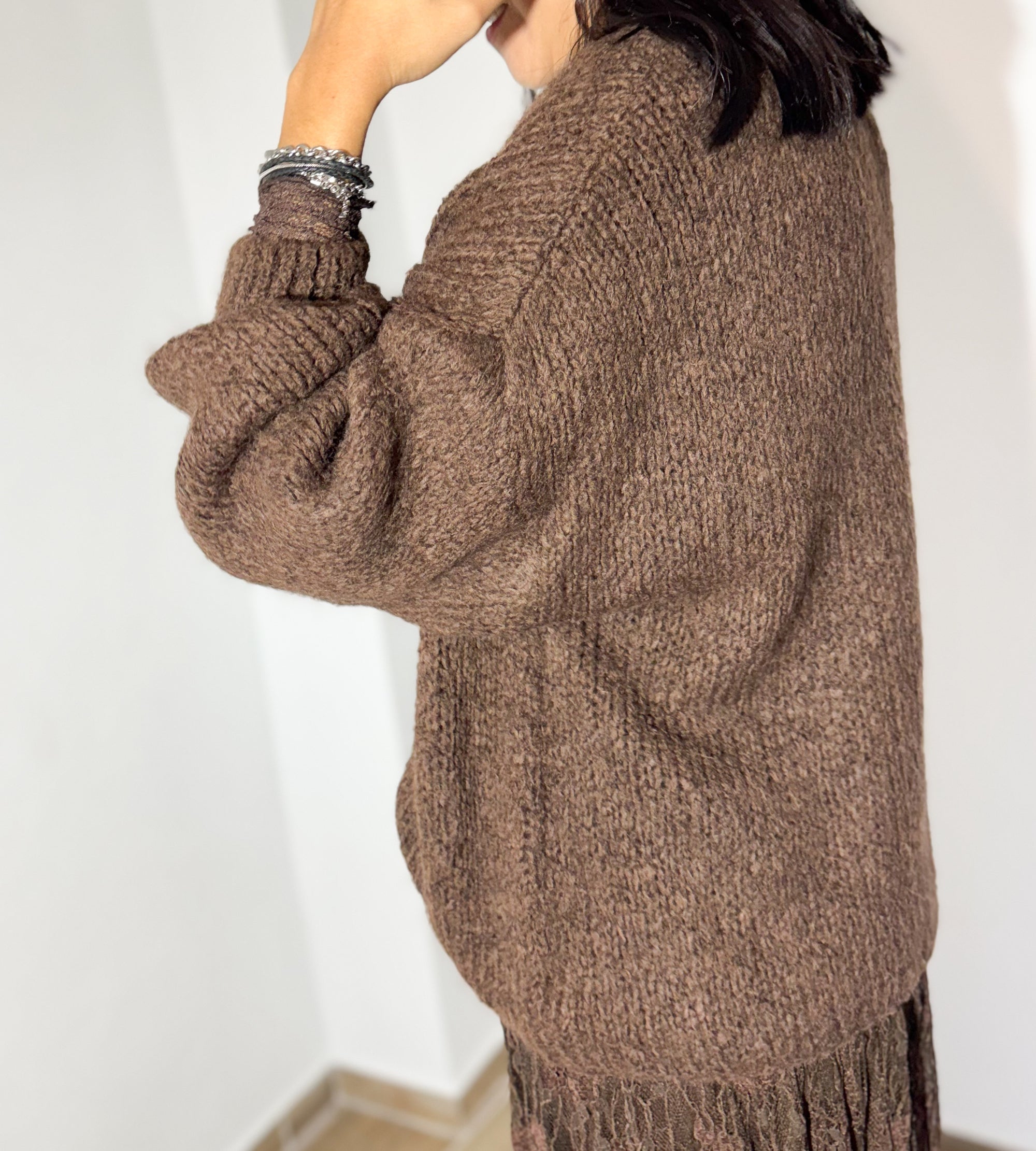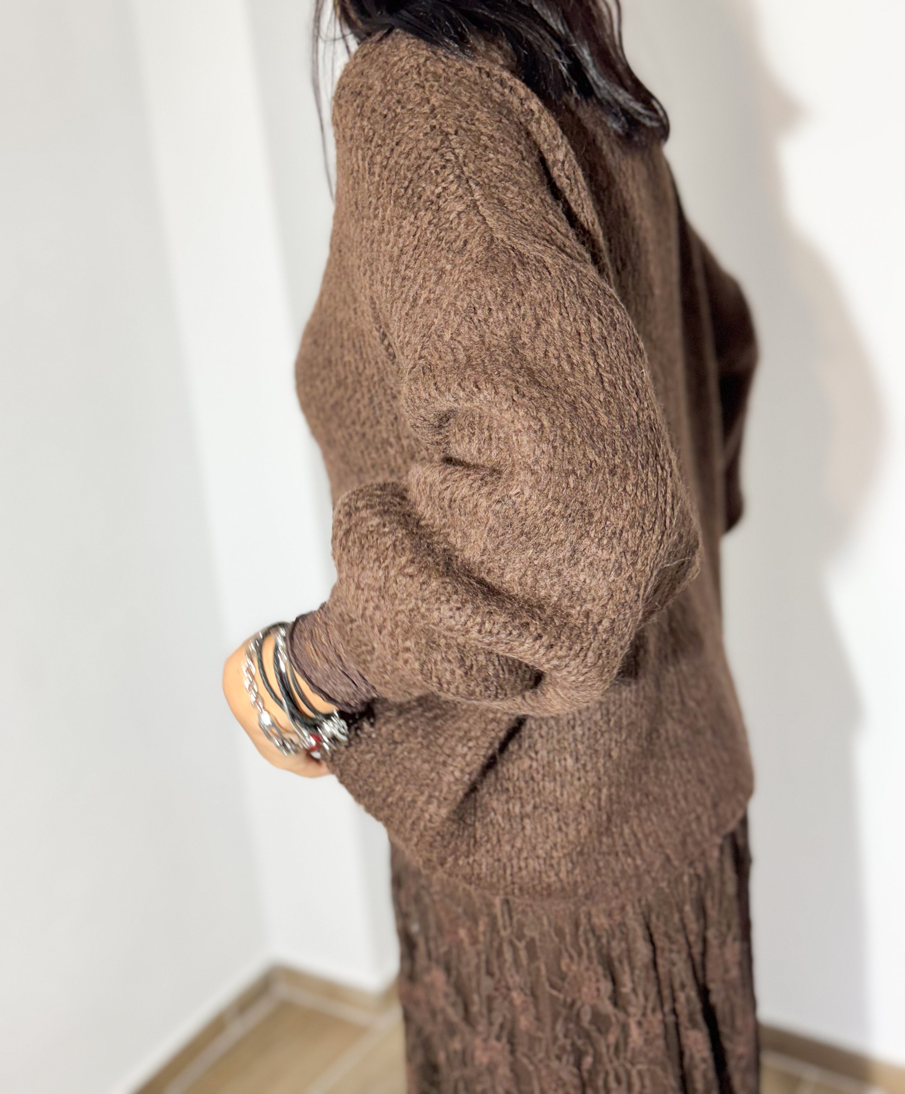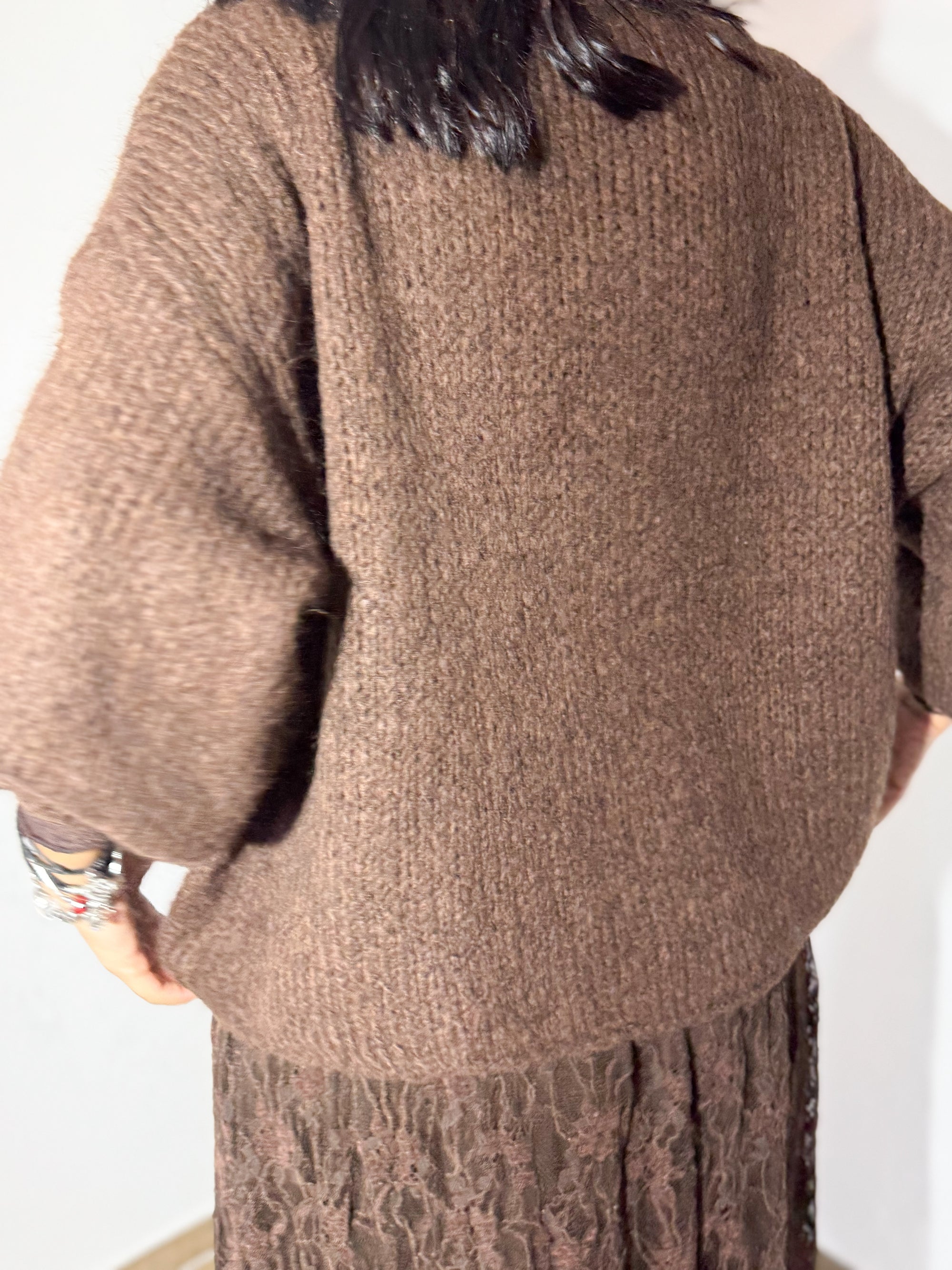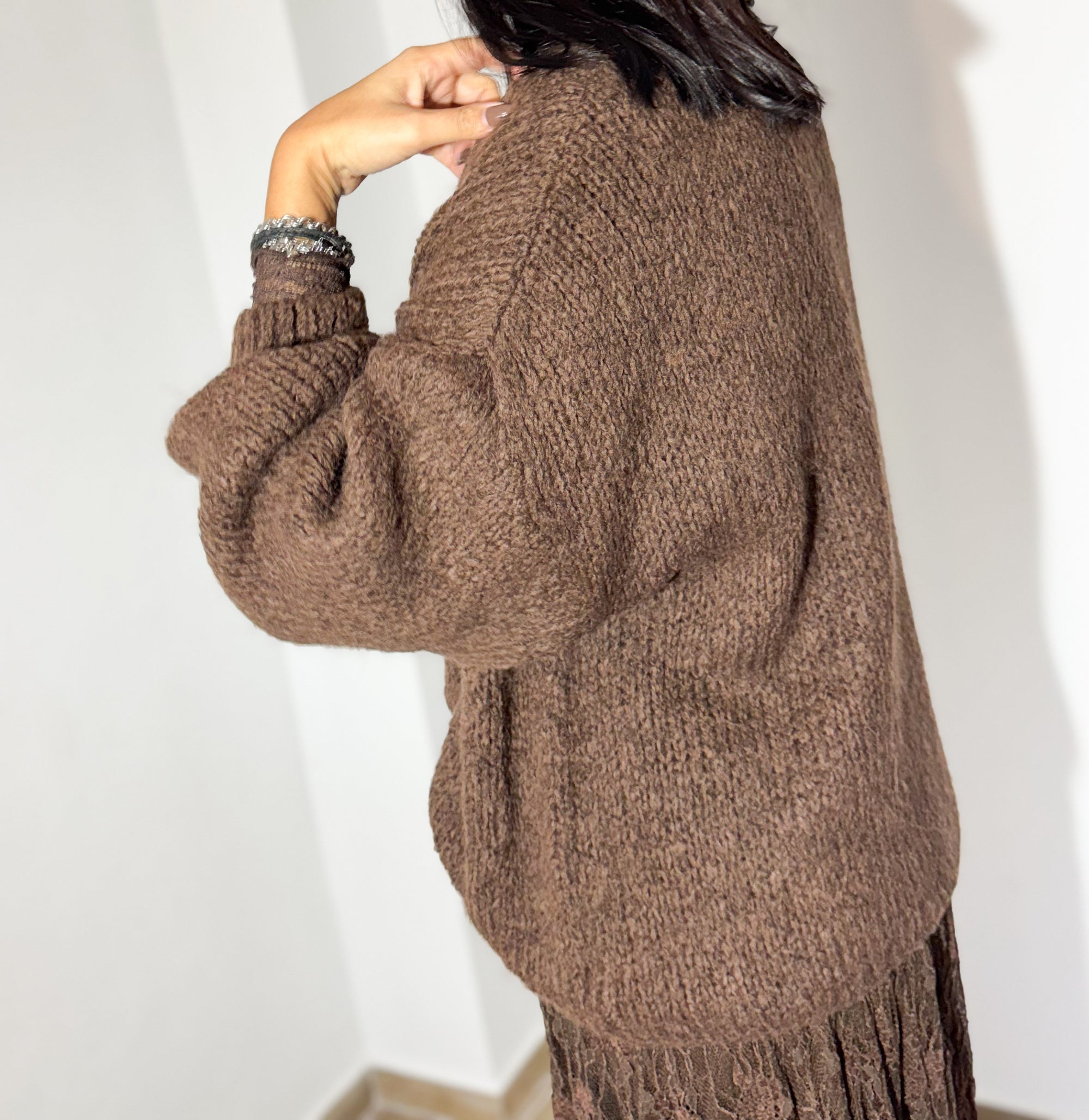 A malha chocolate, de toque macio e corte descontraído, combina de forma perfeita com a saia rendada no mesmo tom, criando um visual elegante, feminino e super harmonioso. A mistura de texturas dá profundidade ao outfit, mantendo o conforto sem perder sofisticação.