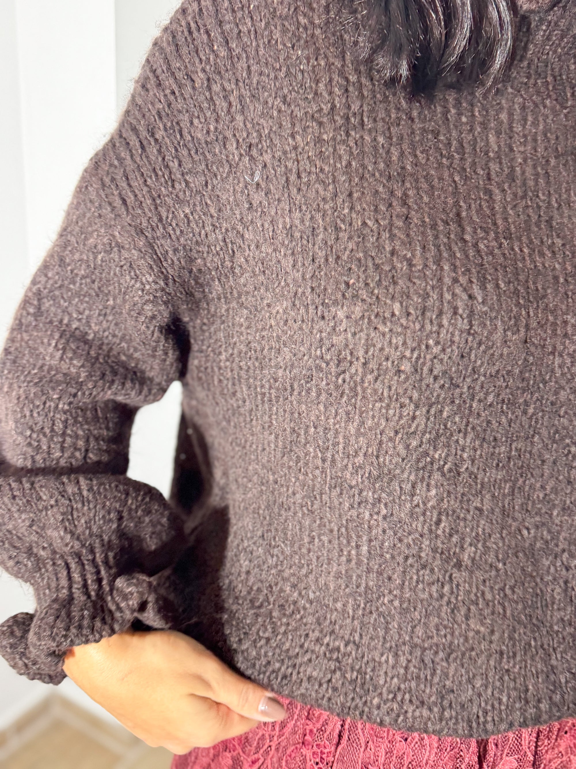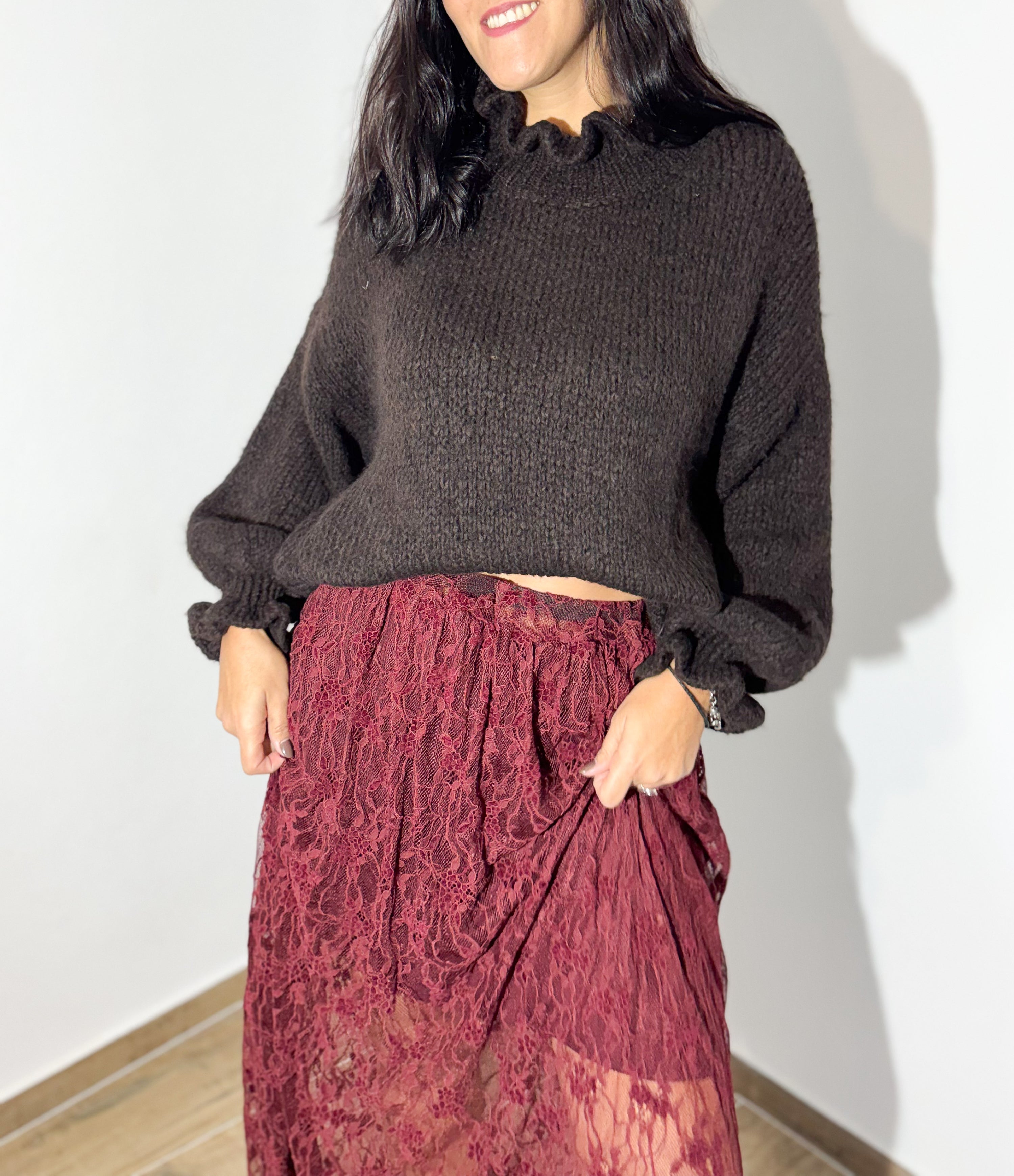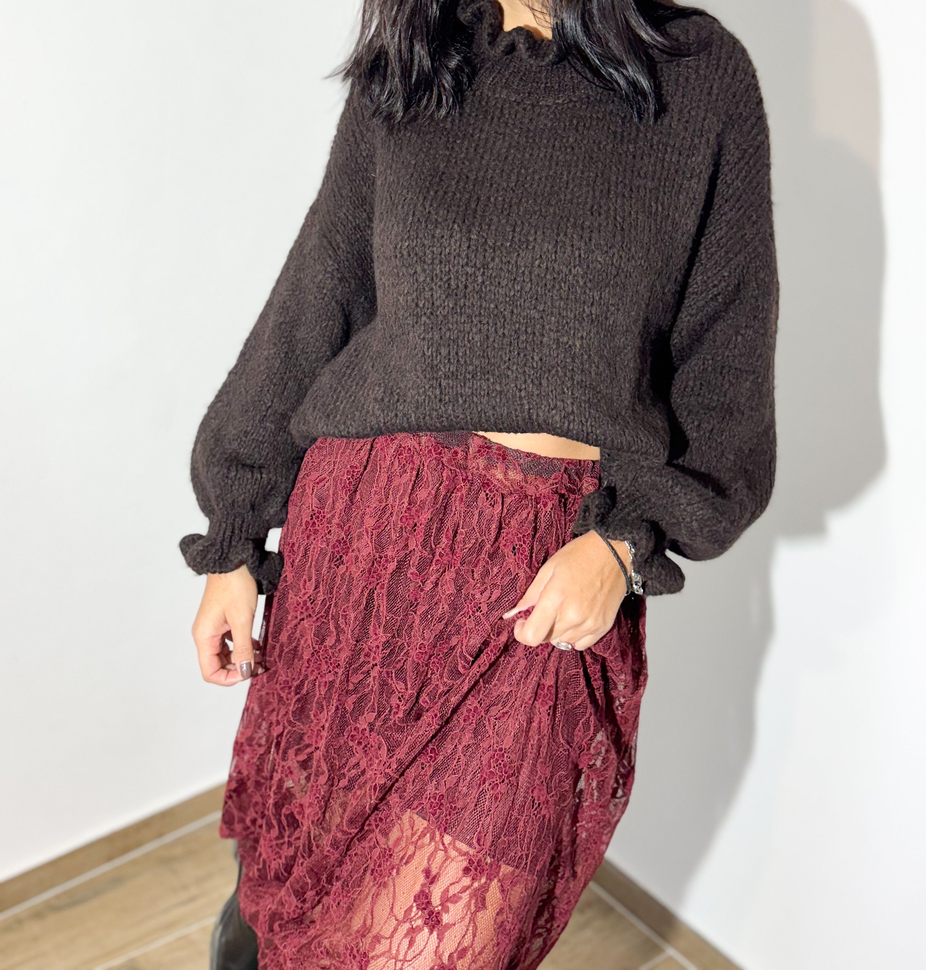 A malha chocolate, de textura macia e mangas com detalhe franzido, cria o equilíbrio perfeito com a saia rendada em borgonha — uma cor profunda e irresistível. O look mistura o cozy do inverno com a delicadeza da renda, resultando num outfit moderno e super sofisticado.