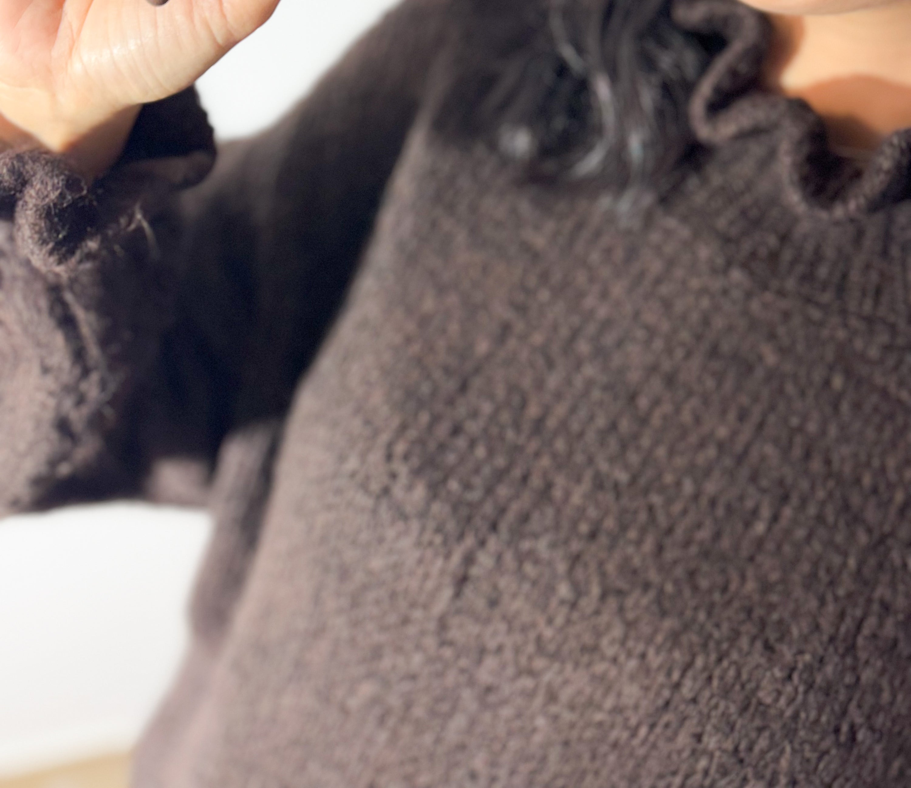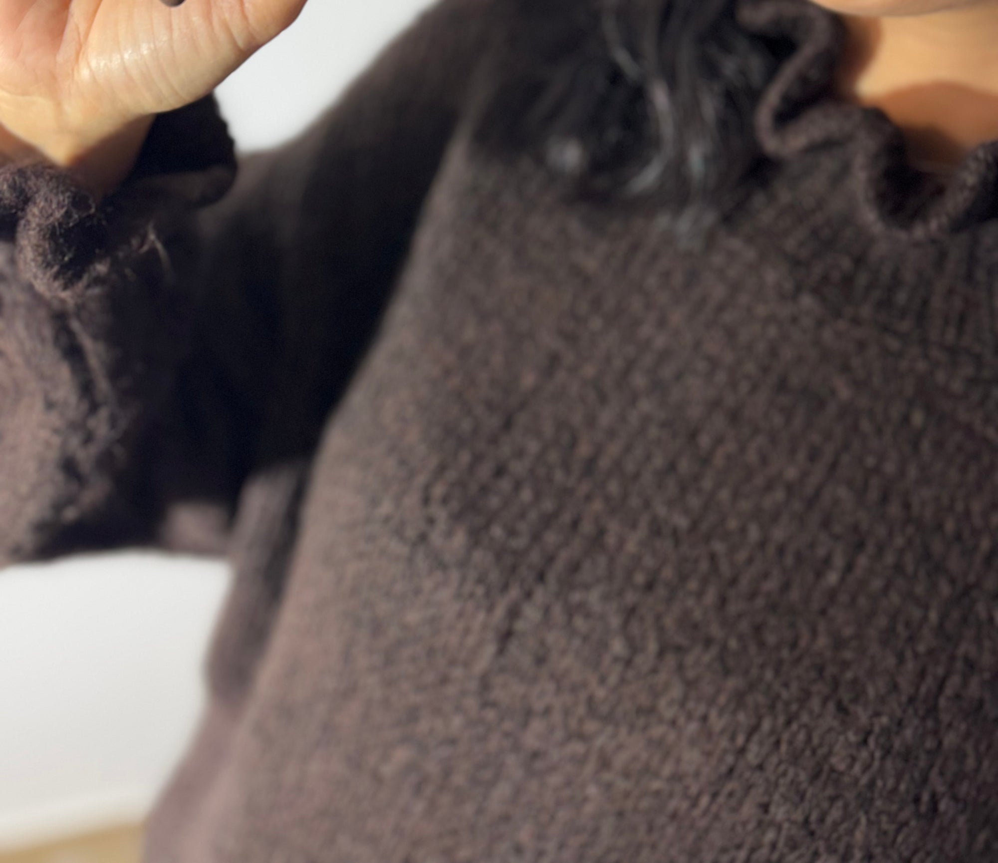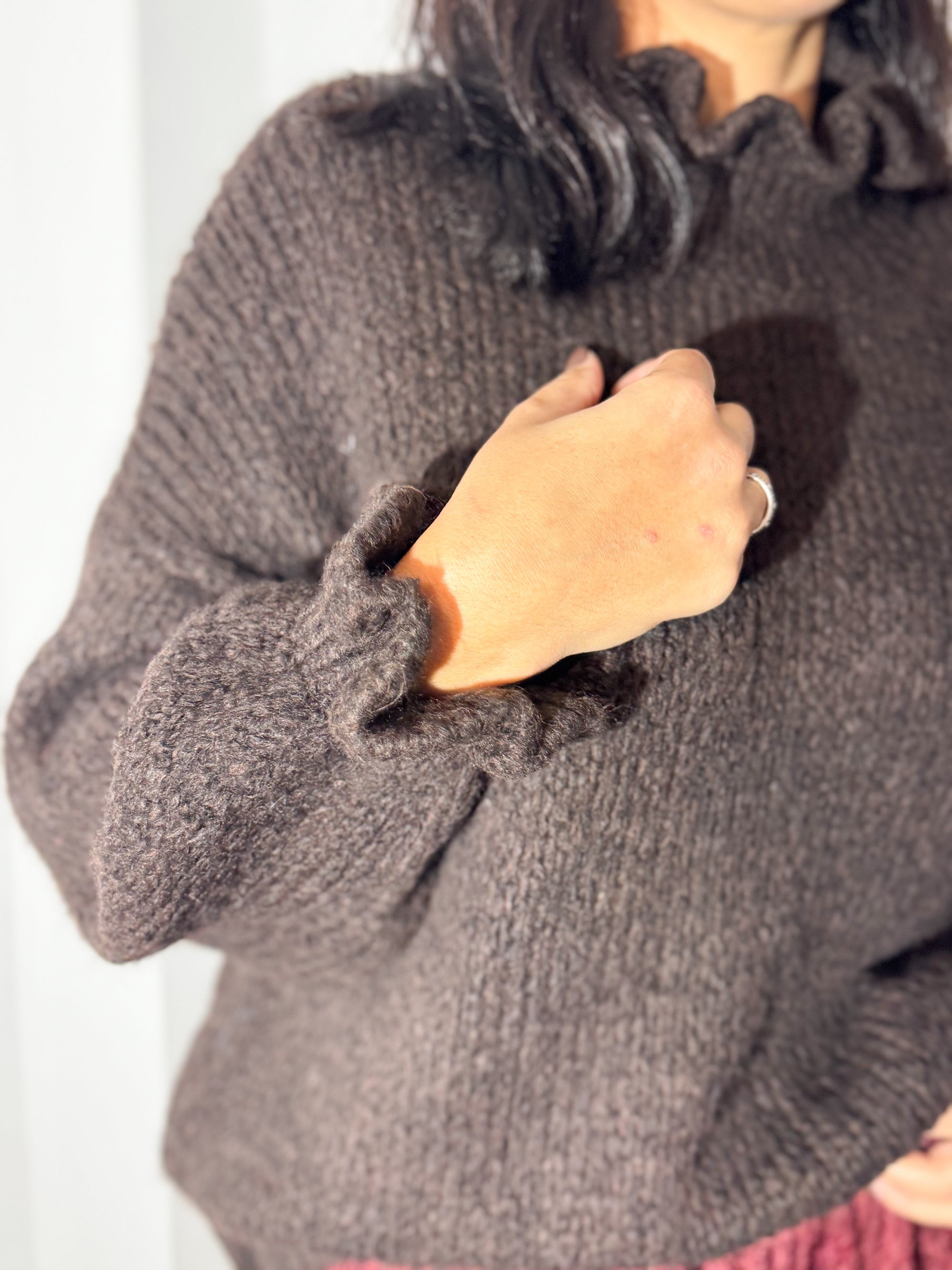 A malha chocolate, de textura macia e mangas com detalhe franzido, cria o equilíbrio perfeito com a saia rendada em borgonha — uma cor profunda e irresistível. O look mistura o cozy do inverno com a delicadeza da renda, resultando num outfit moderno e super sofisticado.