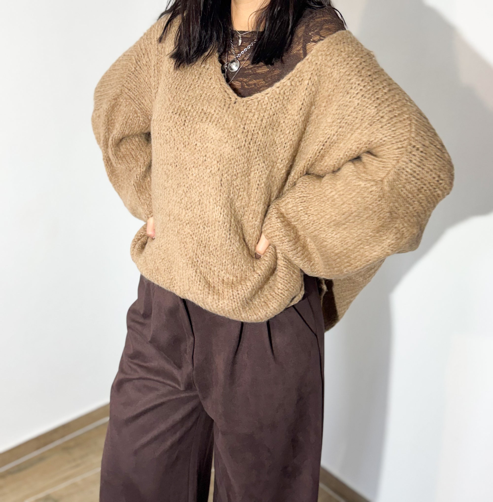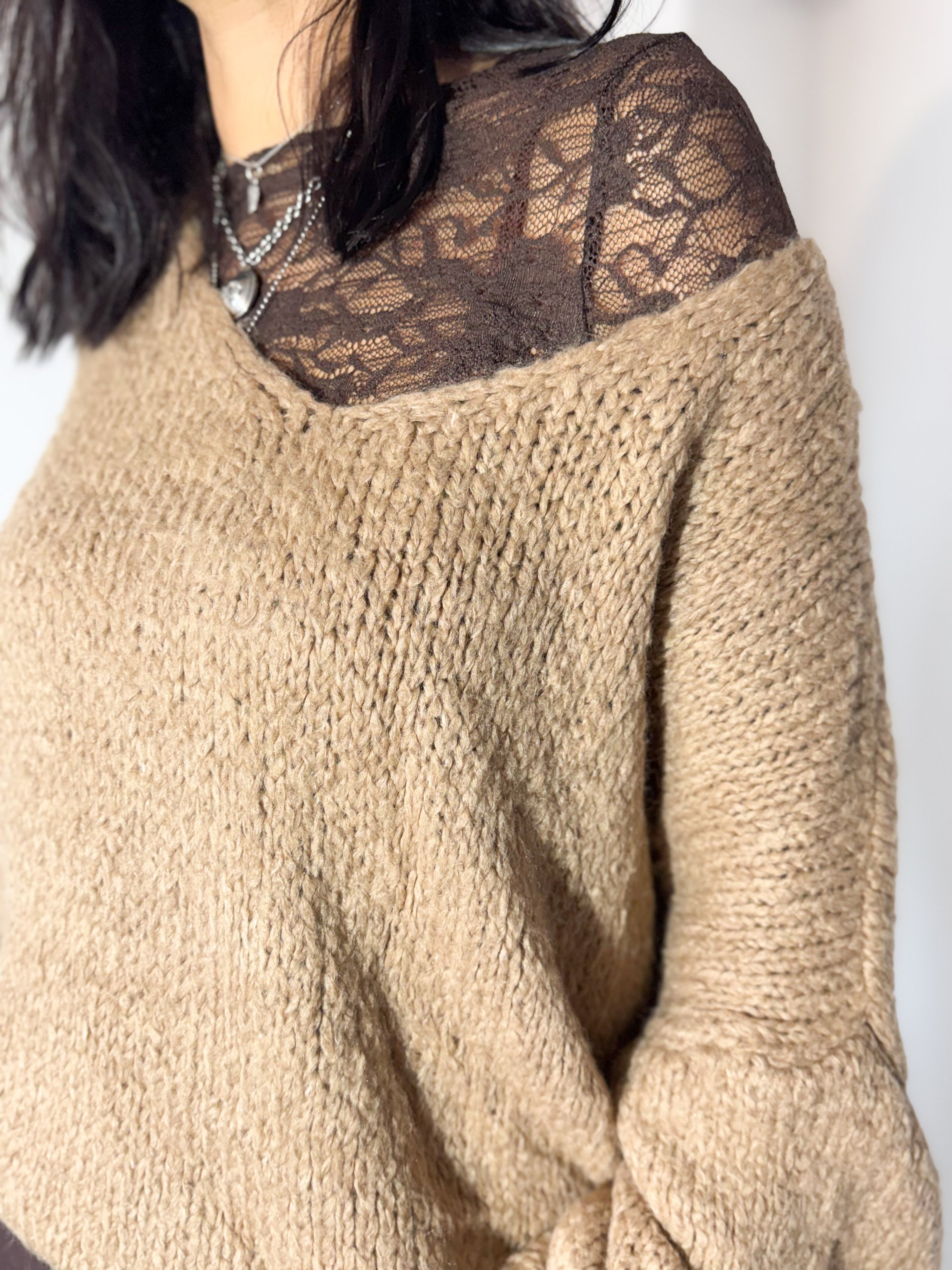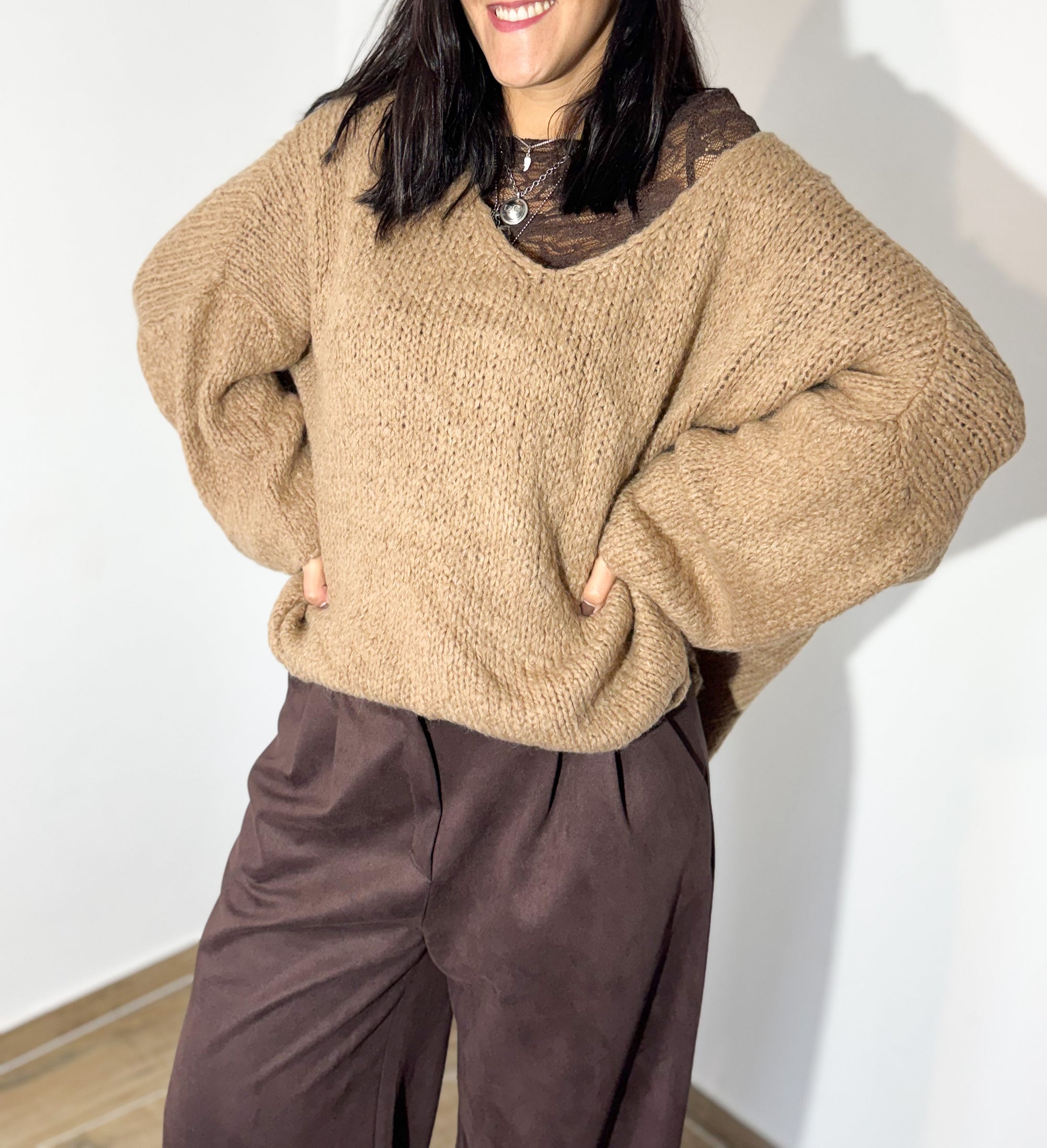 A camisola em malha camel, com corte descontraído e mangas amplas, ganha um toque super feminino com a blusa rendada a espreitar — um detalhe que faz toda a diferença. Combinada com calças de tom chocolate, cria uma paleta sofisticada, neutra e perfeita para o inverno.