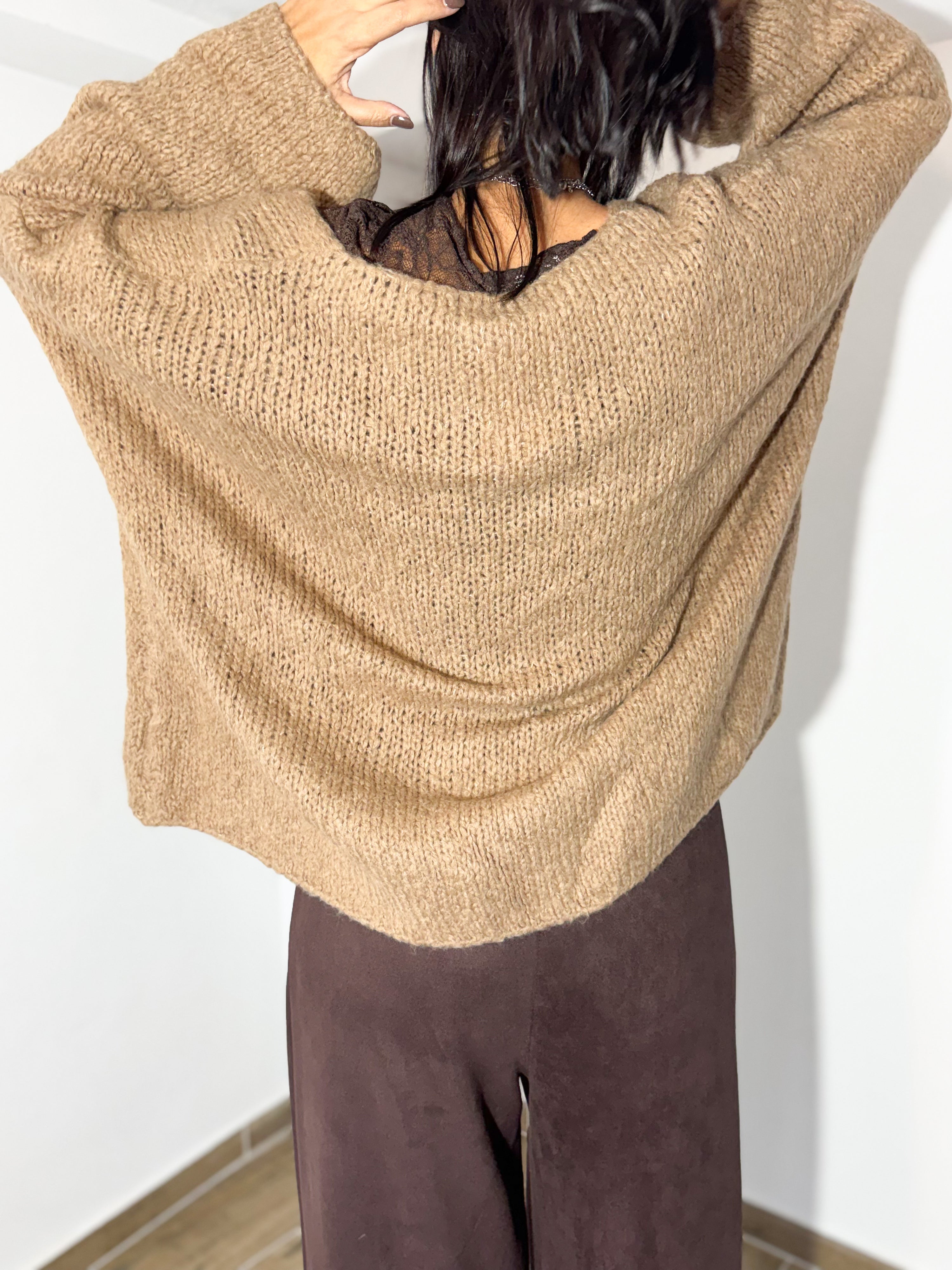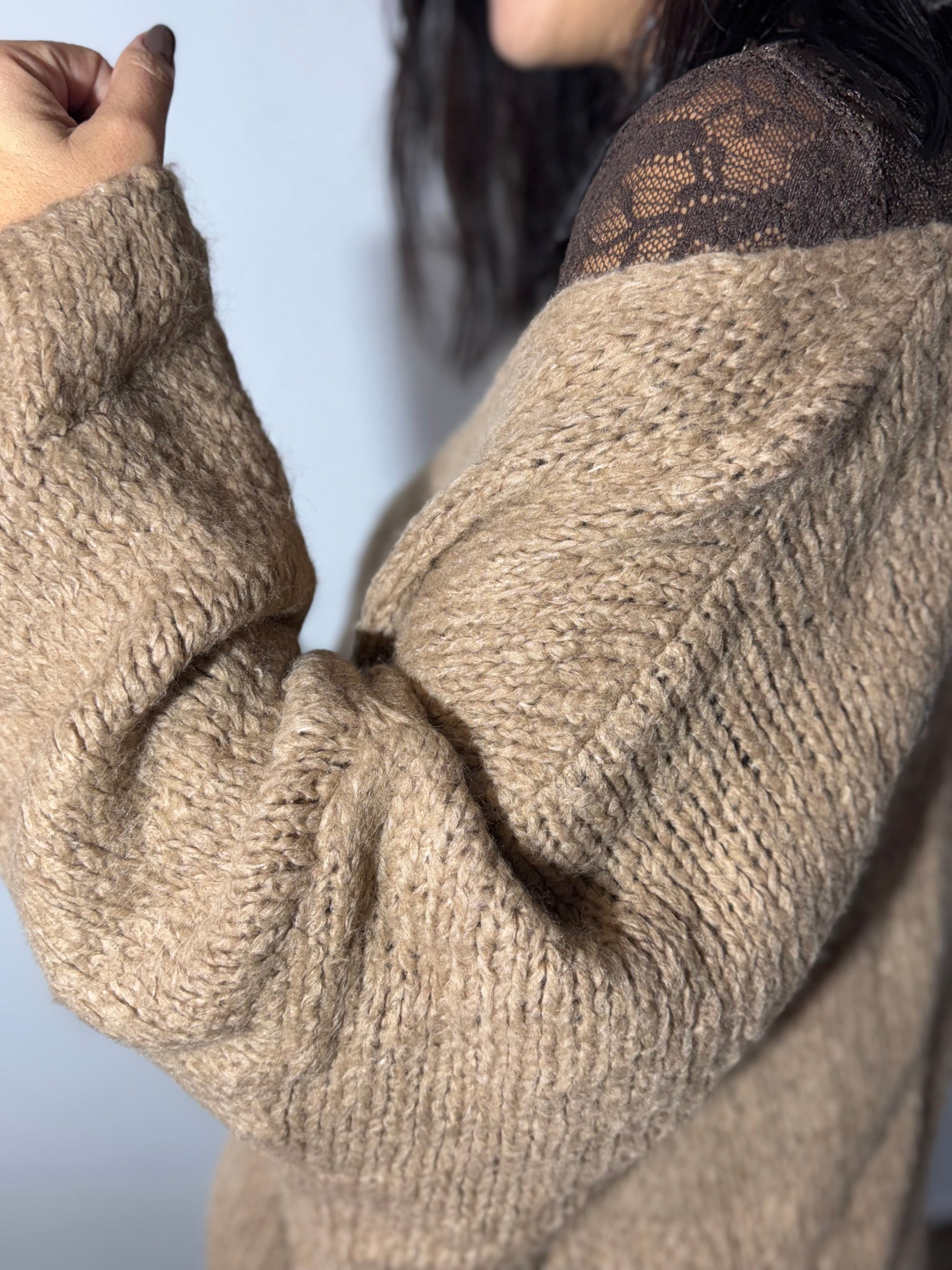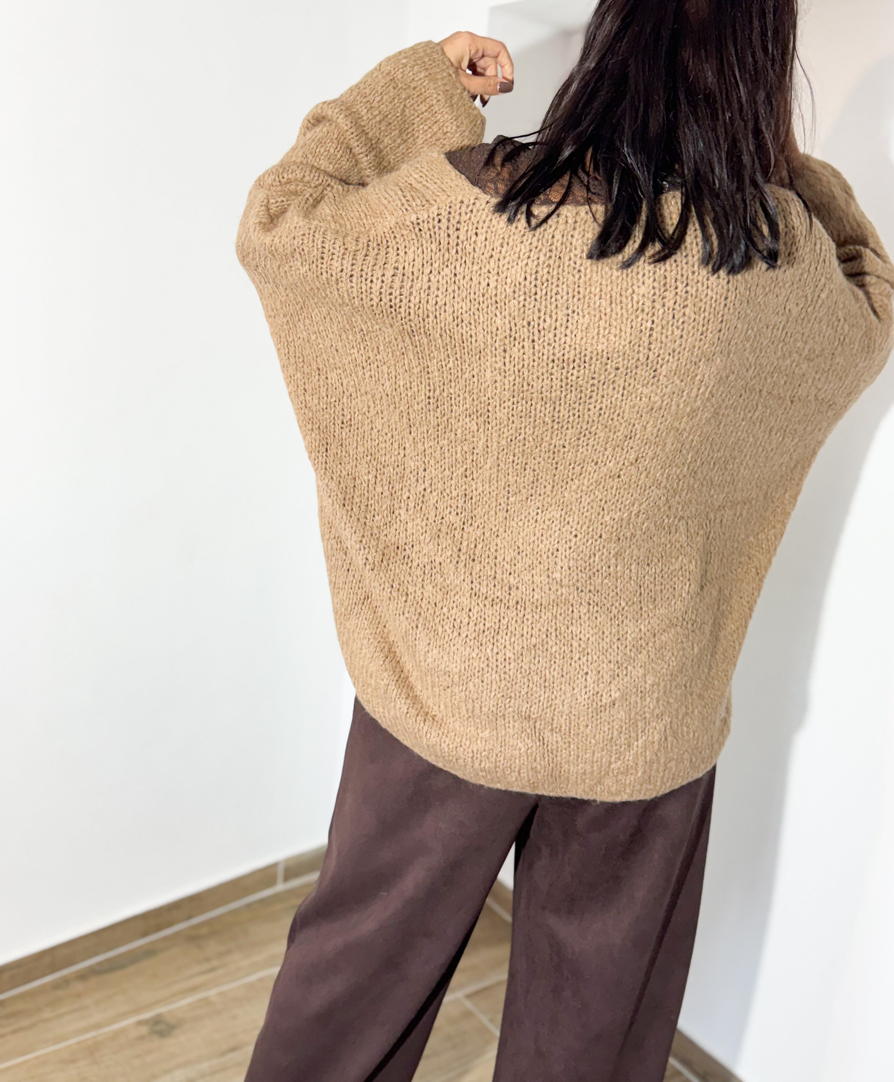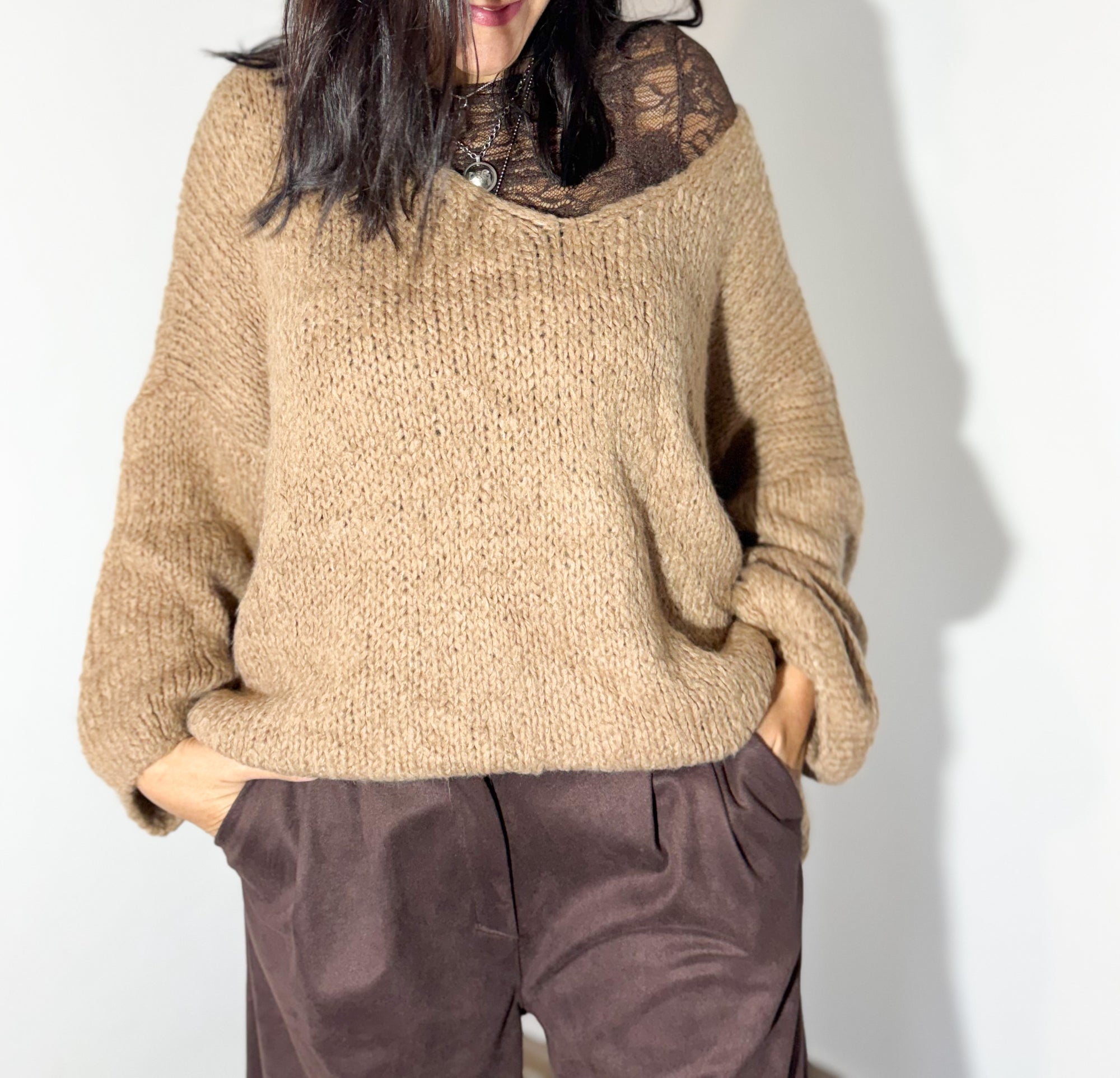 A camisola em malha camel, com corte descontraído e mangas amplas, ganha um toque super feminino com a blusa rendada a espreitar — um detalhe que faz toda a diferença. Combinada com calças de tom chocolate, cria uma paleta sofisticada, neutra e perfeita para o inverno.