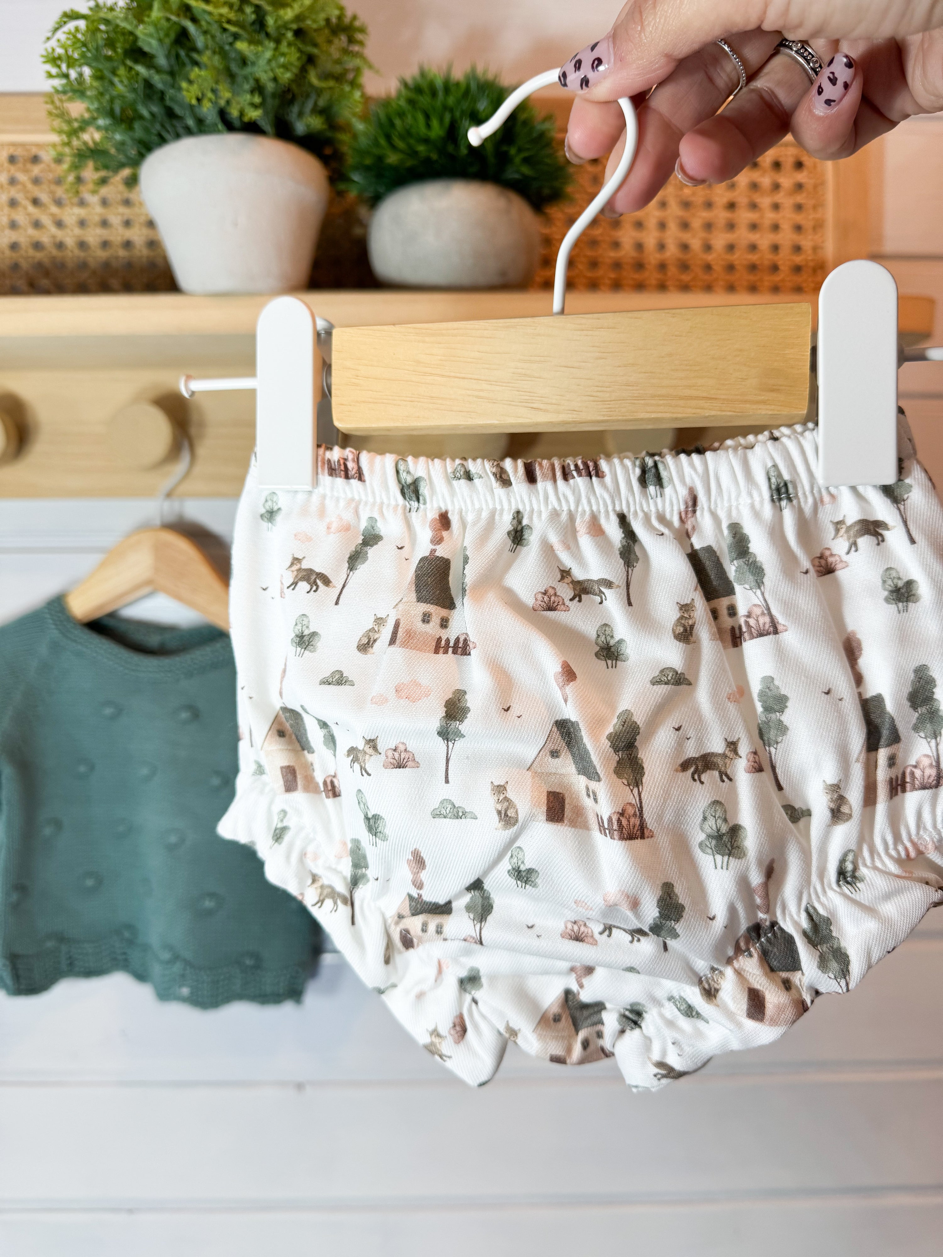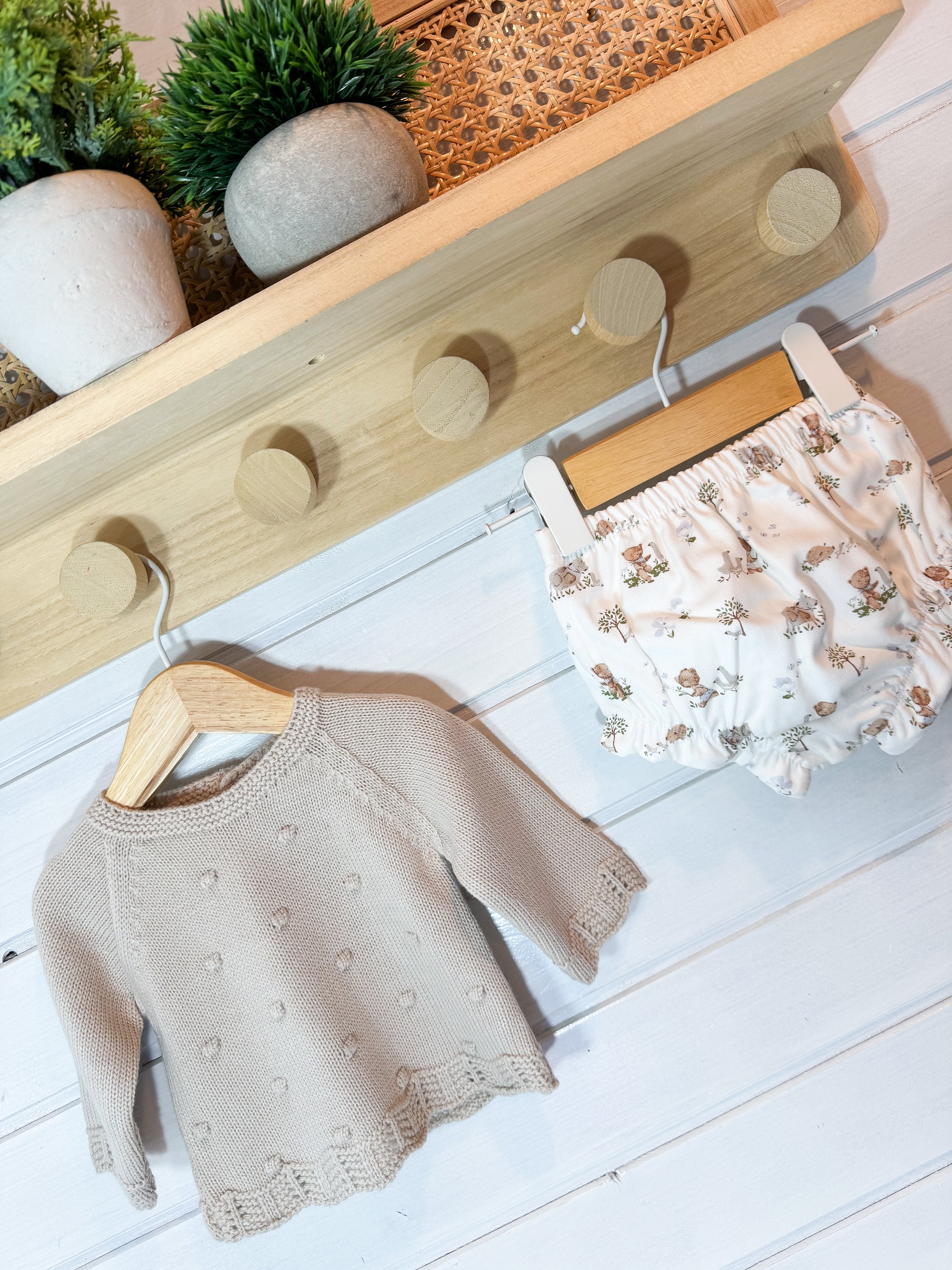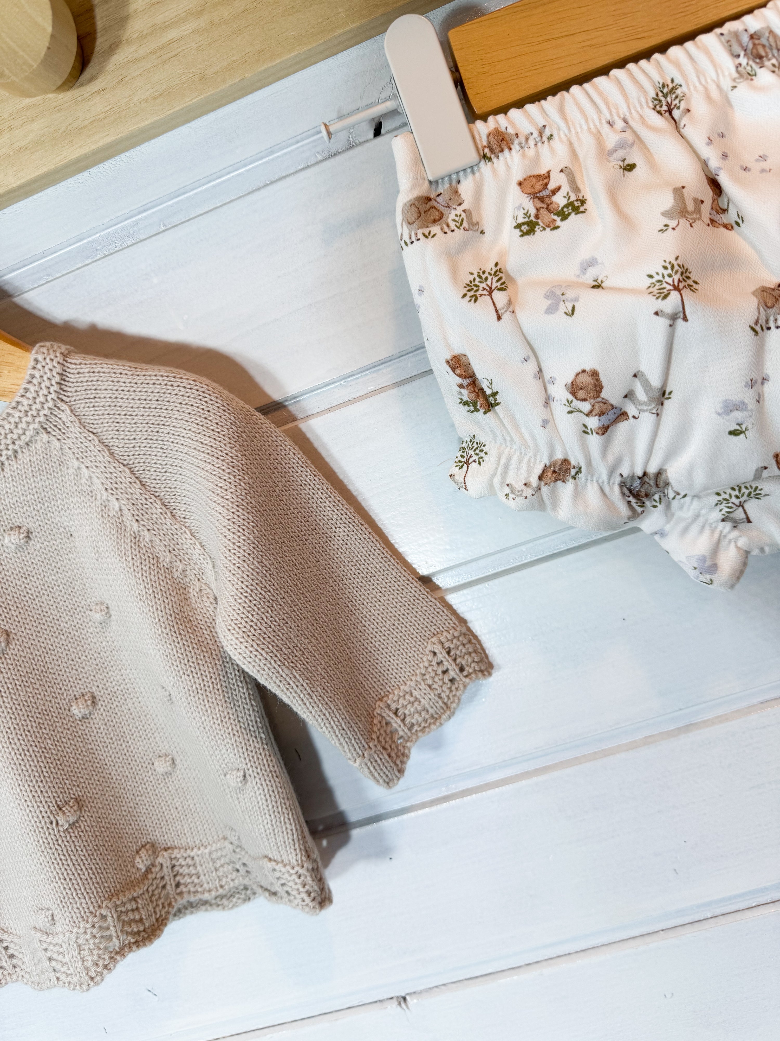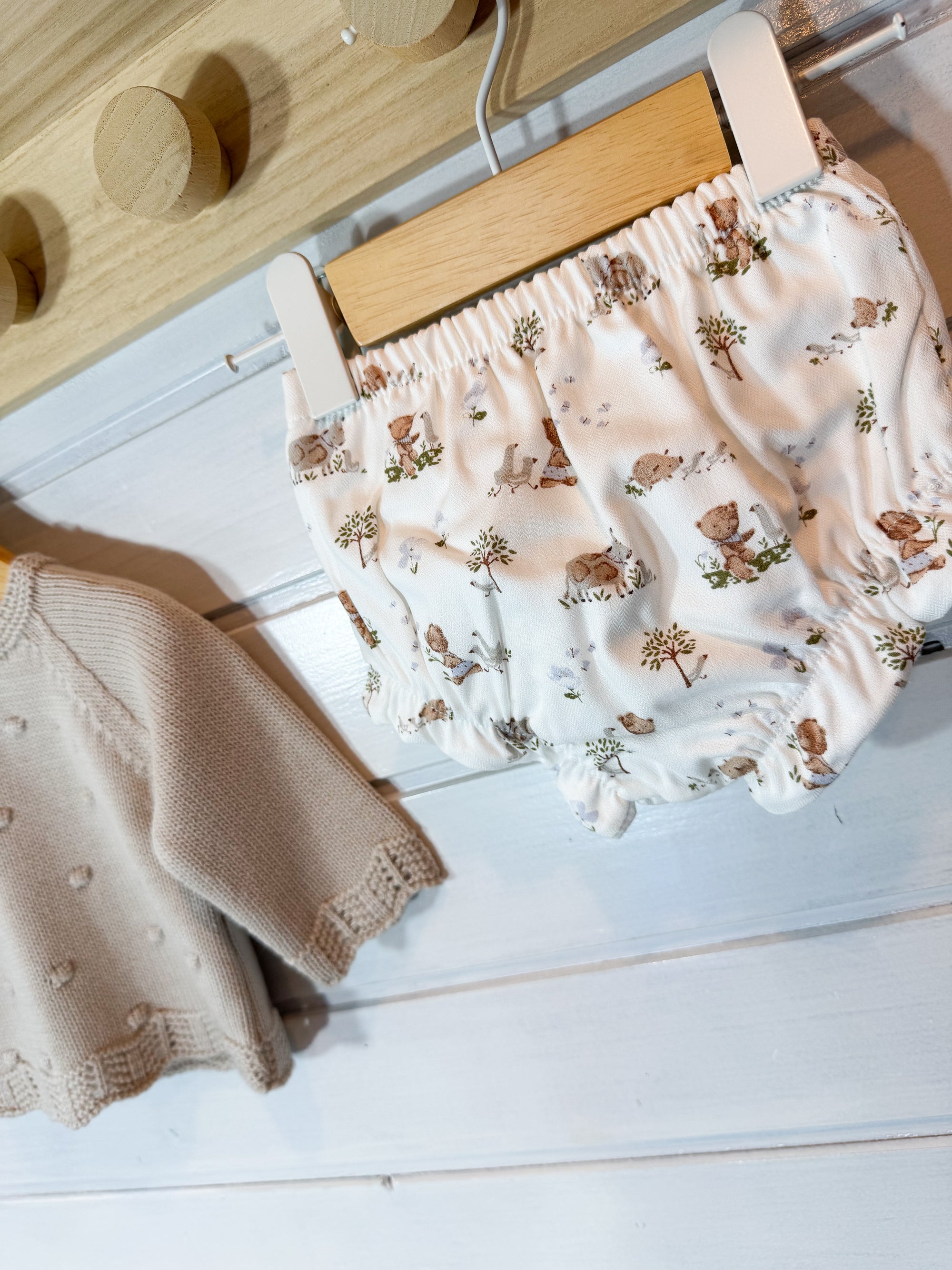 O tapa-fraldas em tecido leve e suave complementa o conjunto, garantindo conforto e liberdade de movimentos.