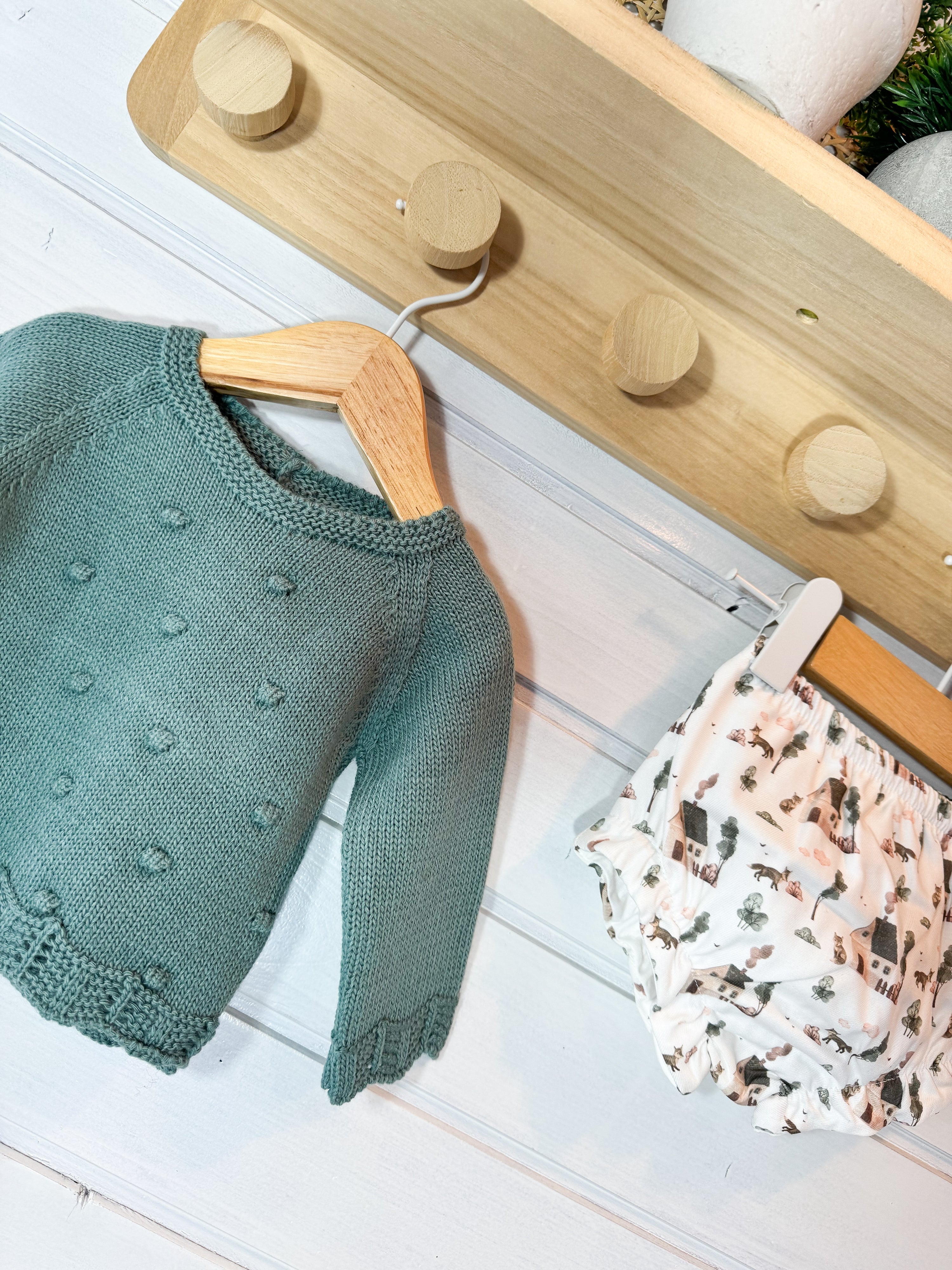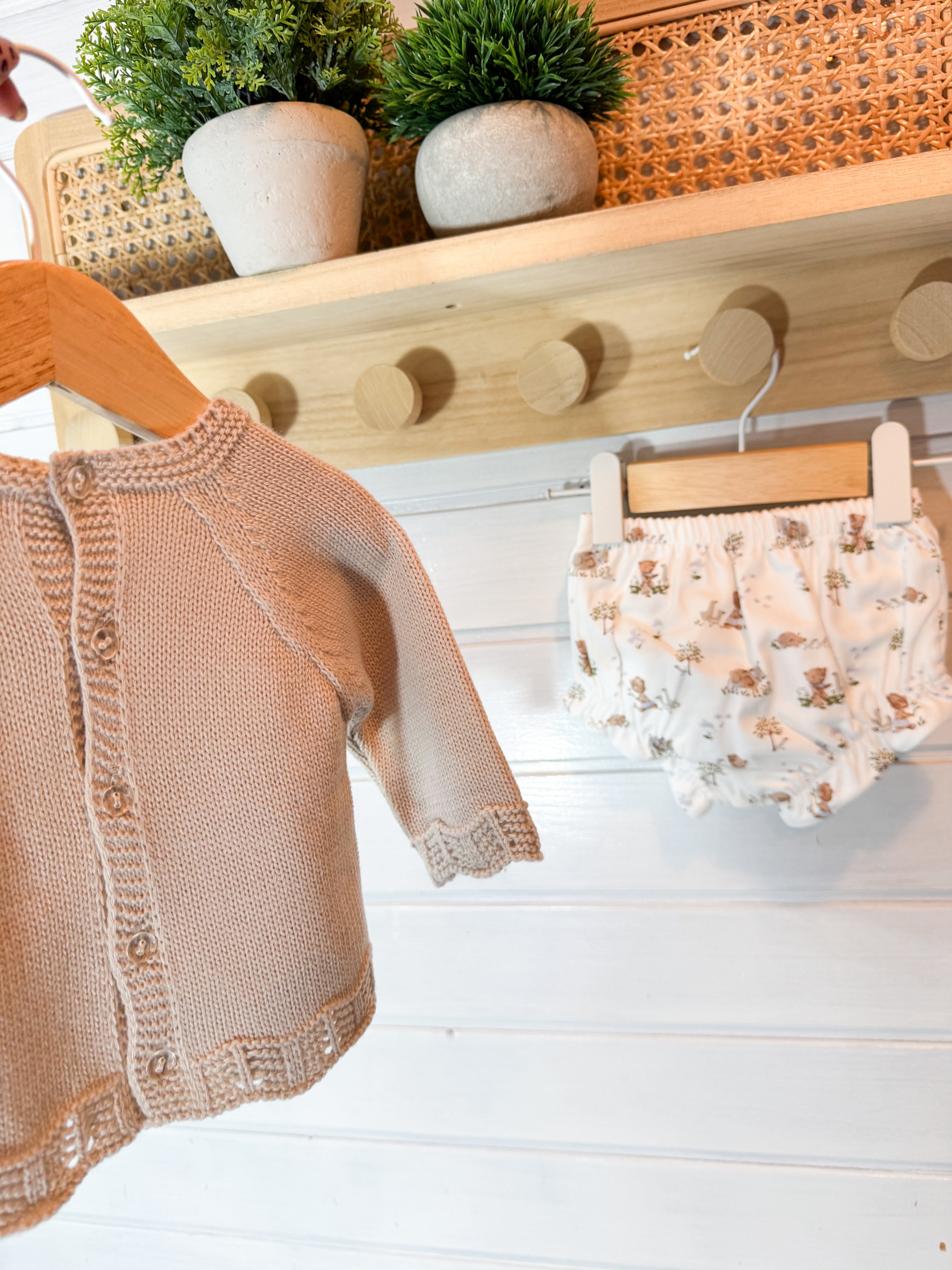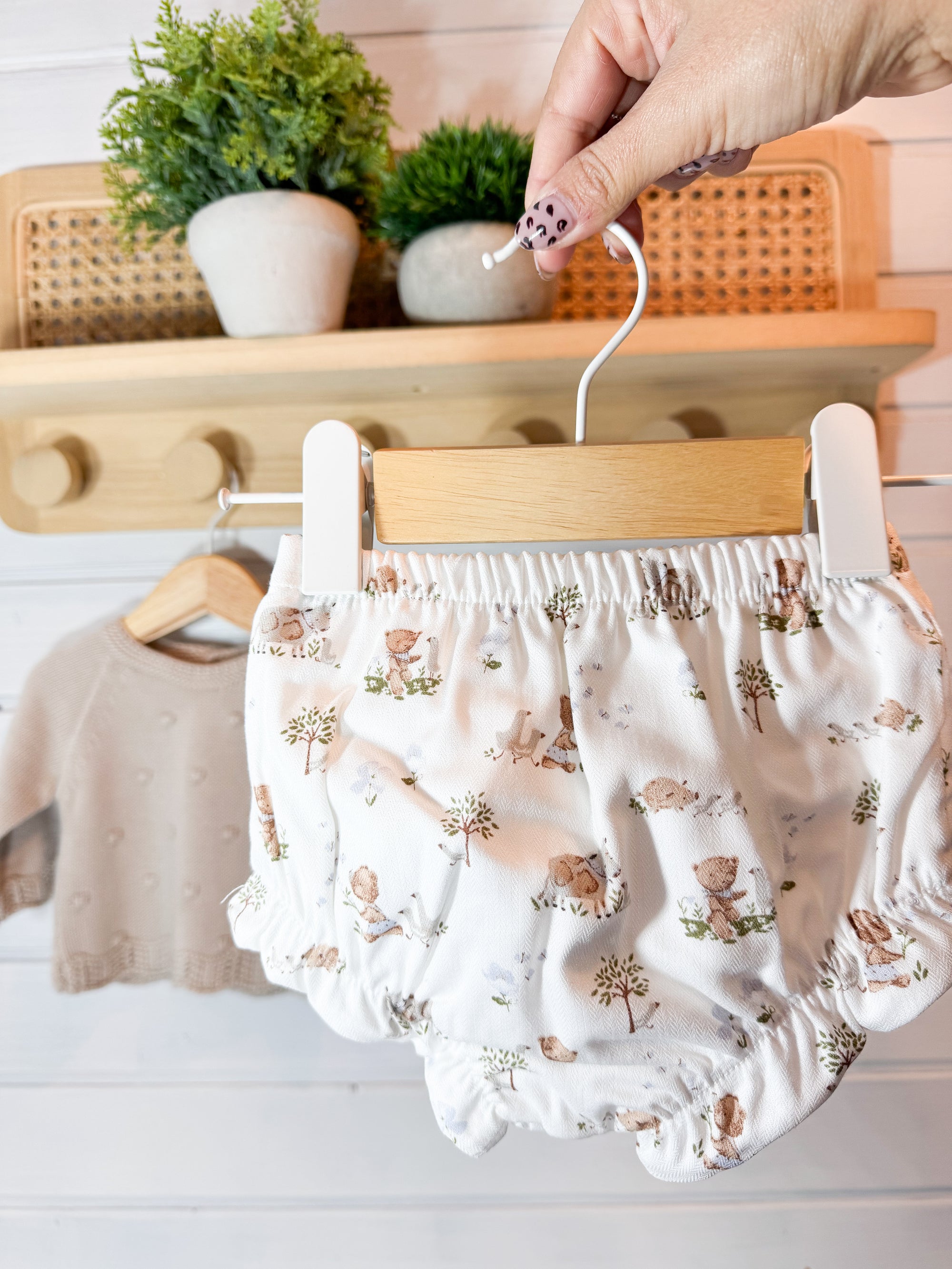 O tapa-fraldas em tecido leve e suave complementa o conjunto, garantindo conforto e liberdade de movimentos.