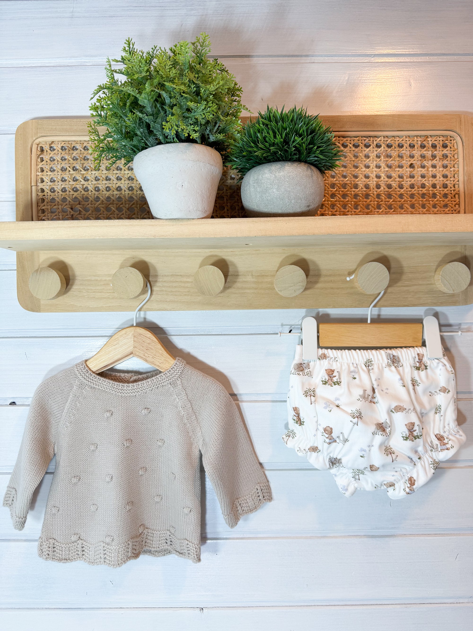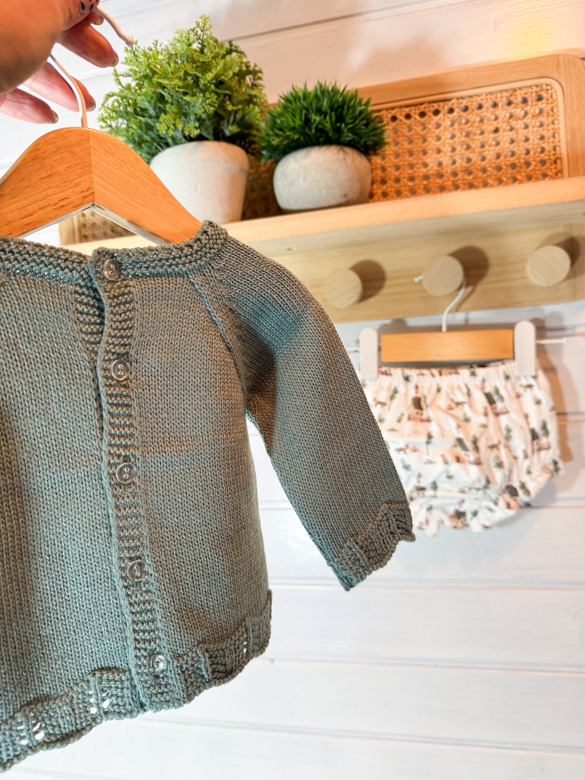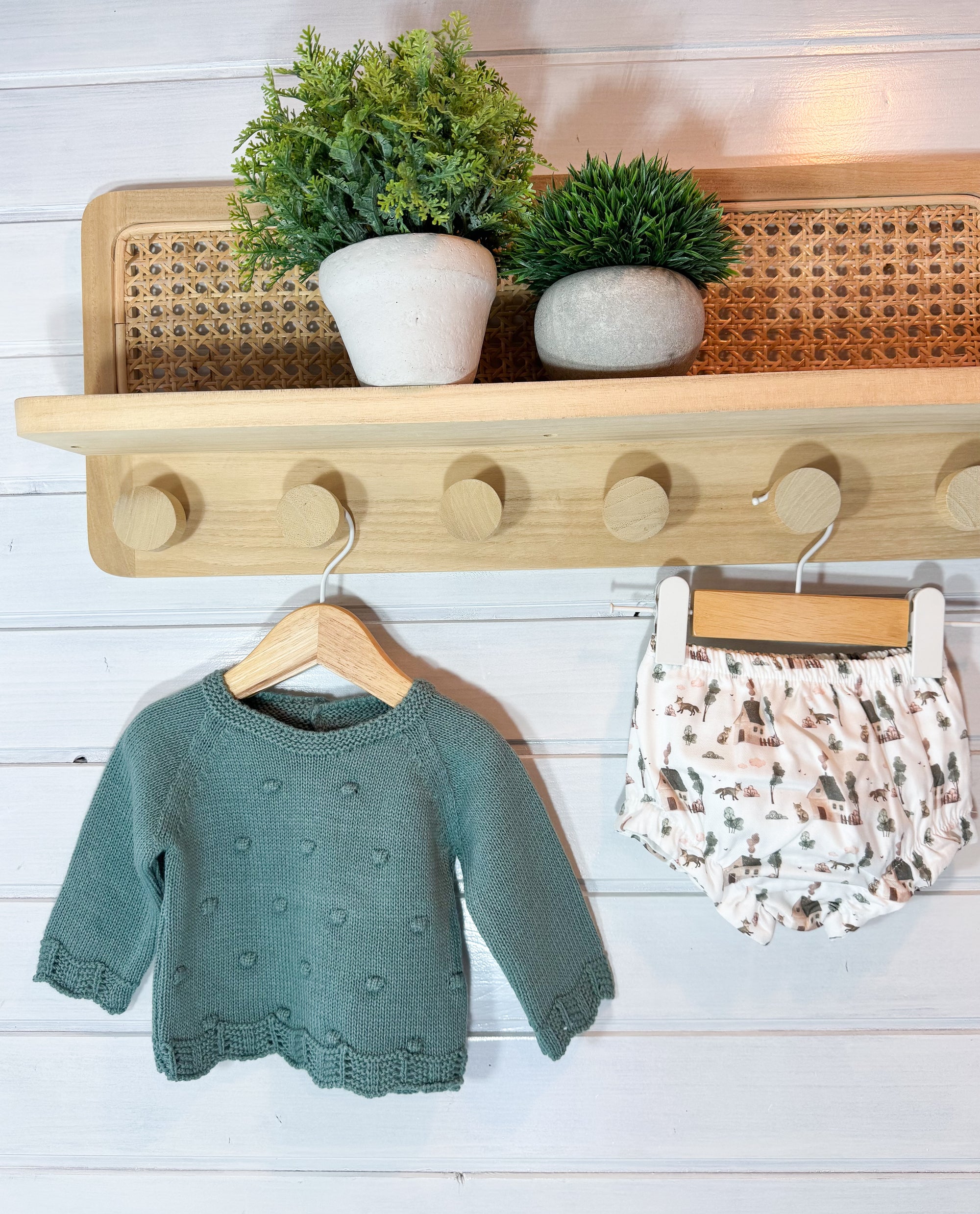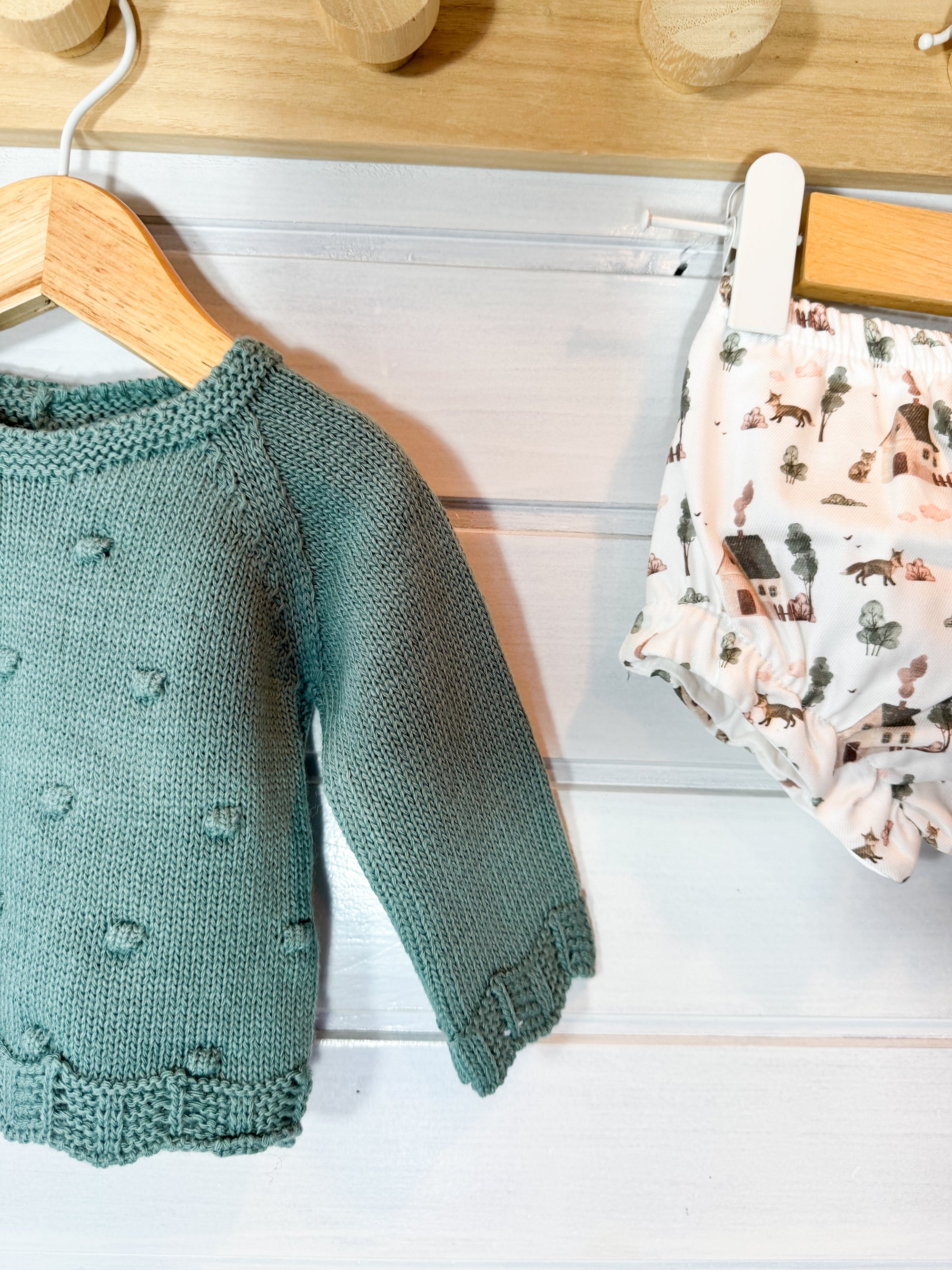 O tapa-fraldas em tecido leve e suave complementa o conjunto, garantindo conforto e liberdade de movimentos.