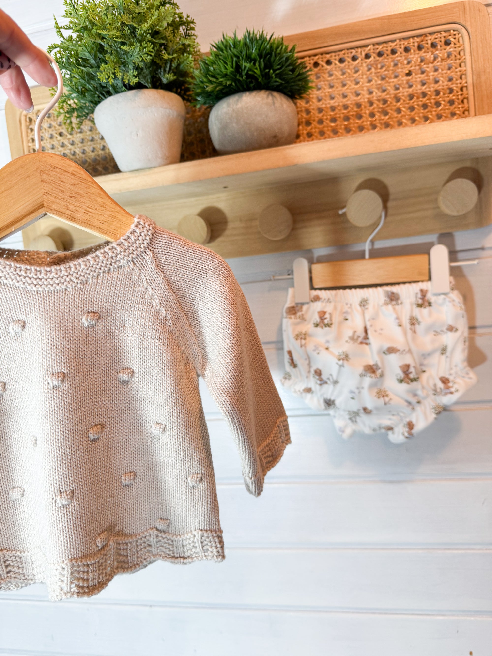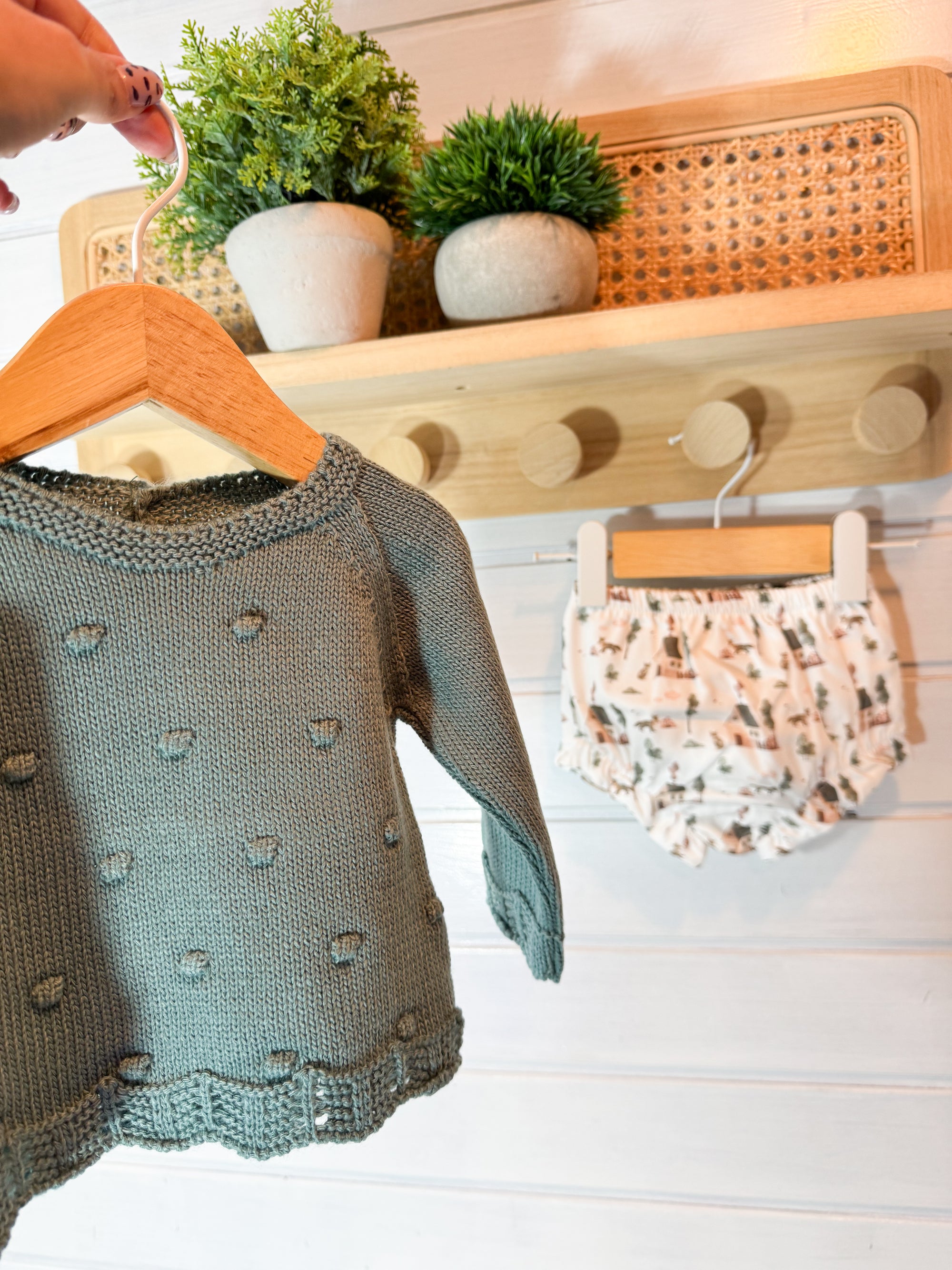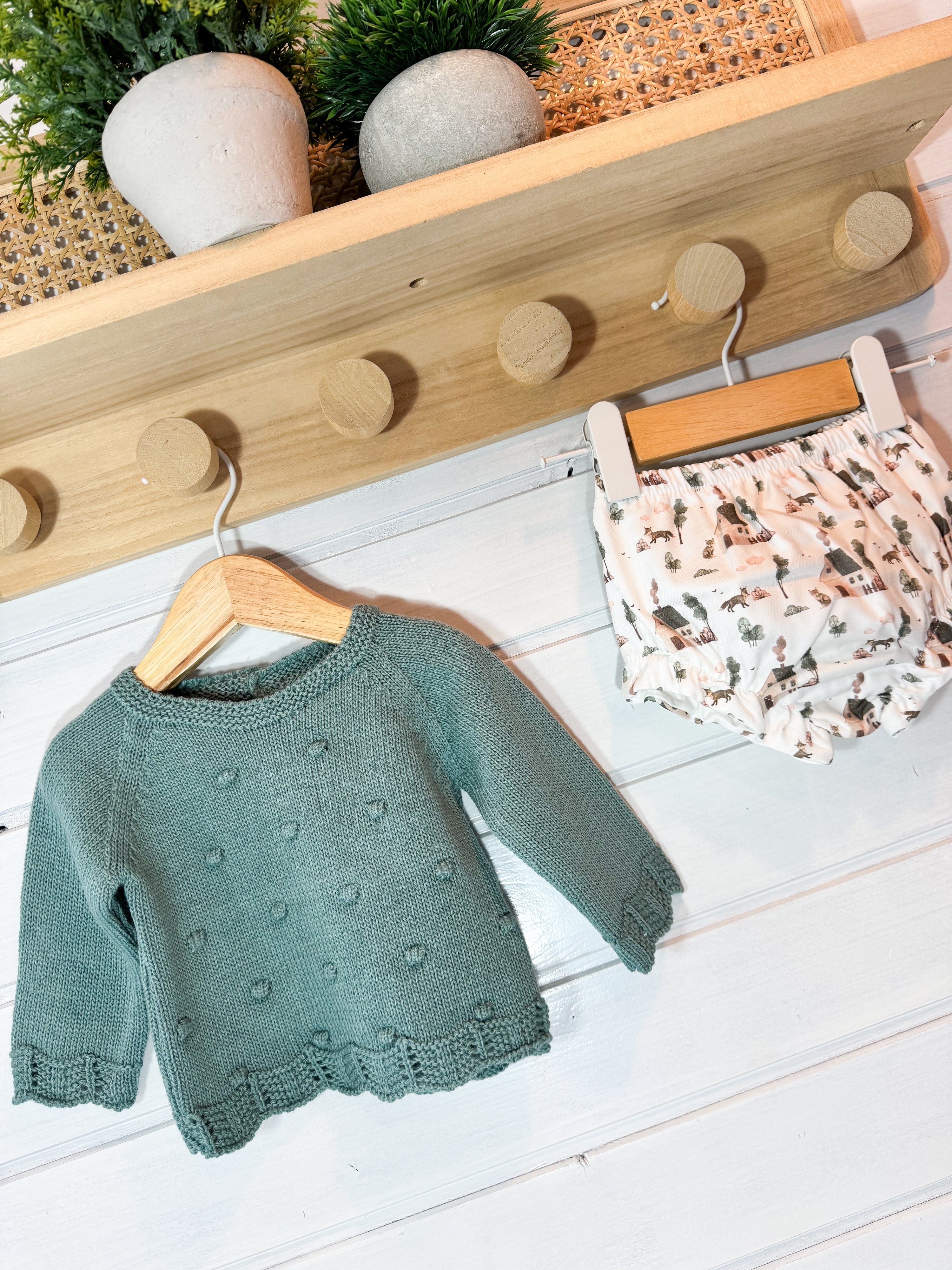 A camisola em malha macia destaca-se pelas delicadas bolinhas em relevo e pelos acabamentos ondulados, que acrescentam textura e um toque artesanal à peça.