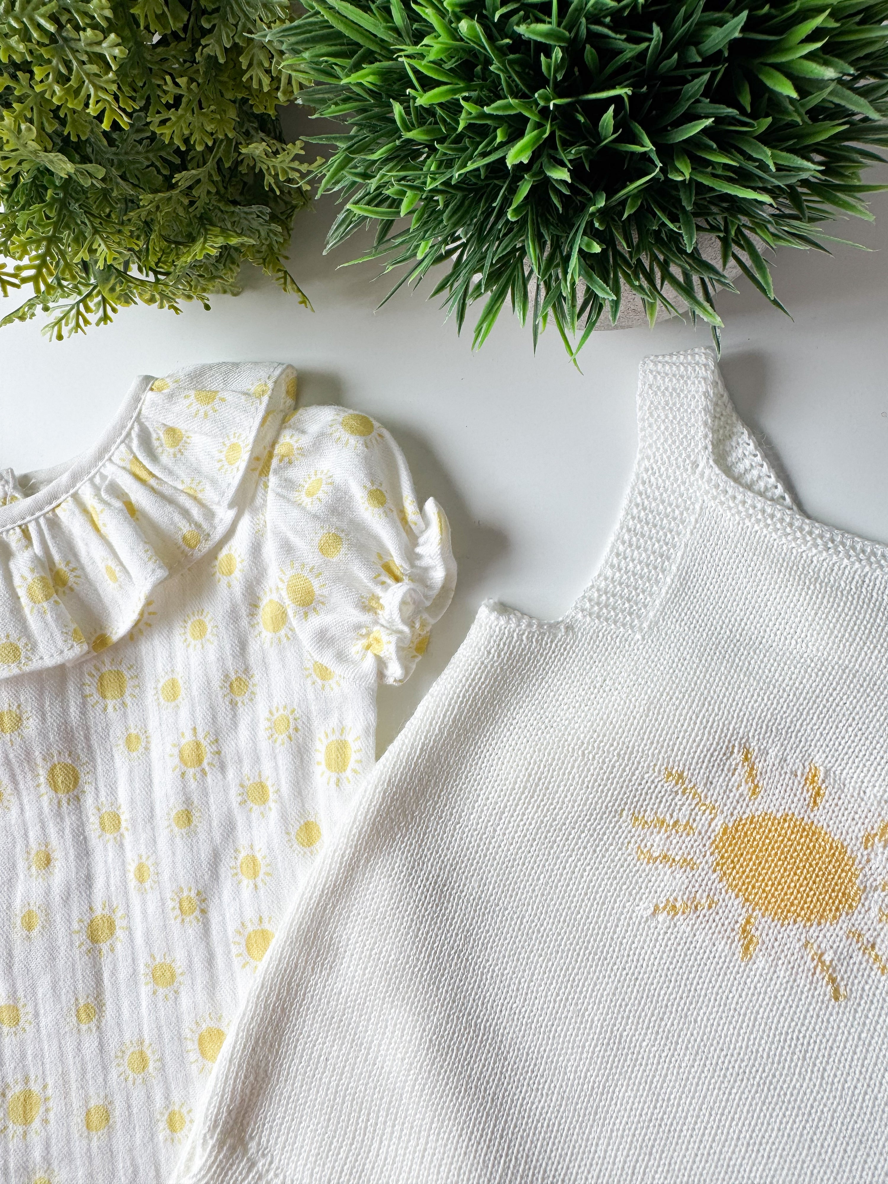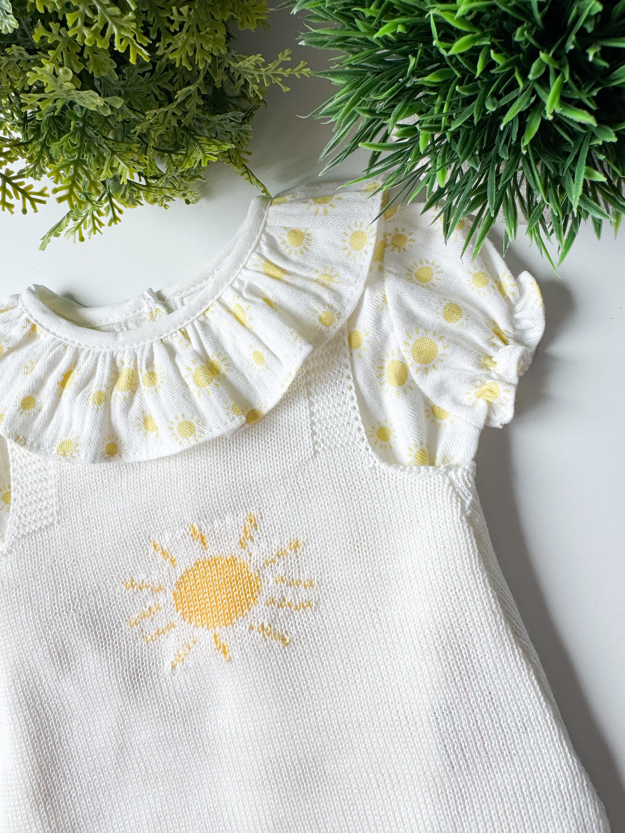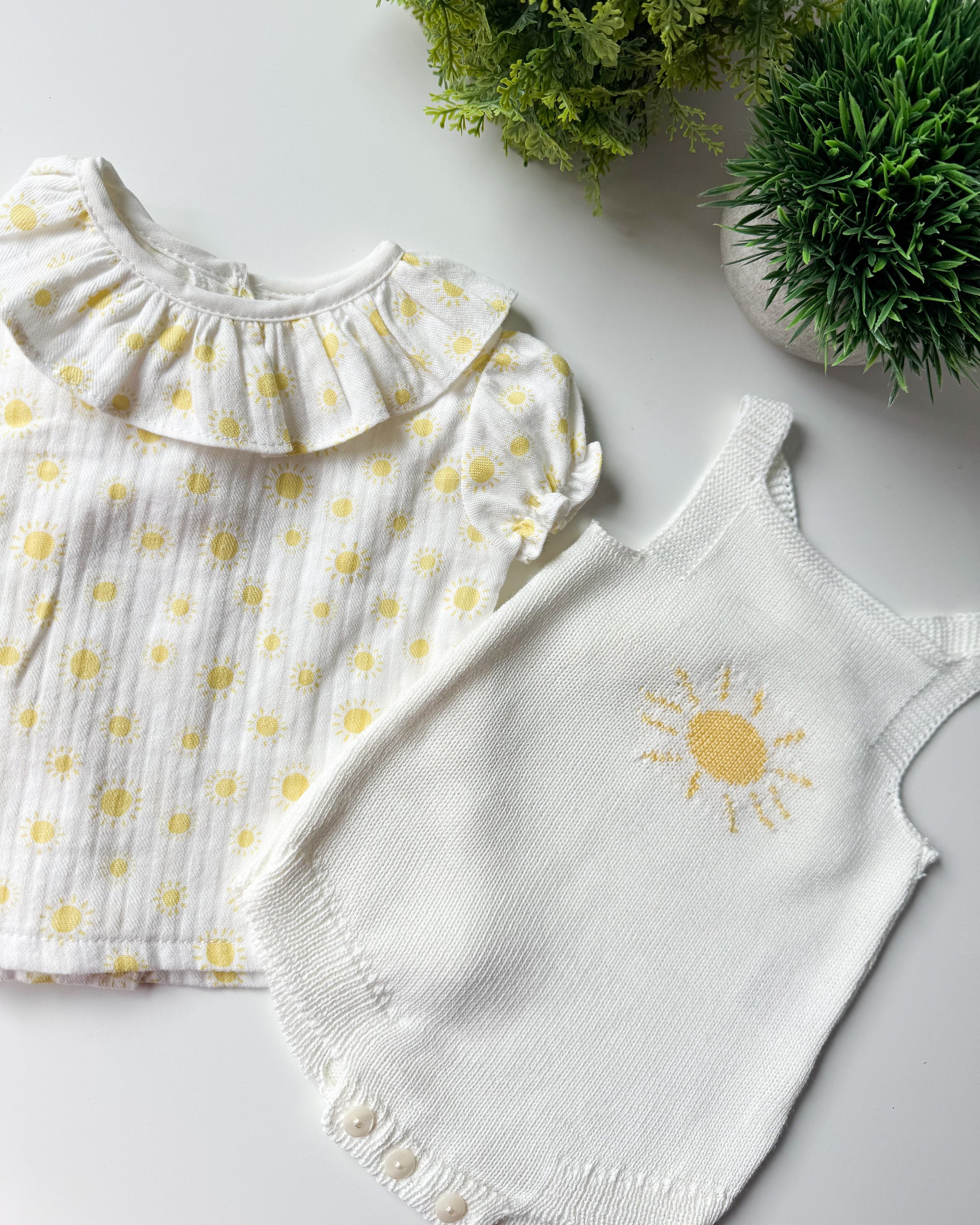 Um conjunto luminoso e delicado, inspirado na leveza dos dias de sol. Inclui blusa em algodão suave com padrão de sóis em tom amarelo pastel e folho subtil na gola, combinada com fofo em malha de algodão, confortável e macia, com detalhe de sol em destaque. Uma peça fresca, doce e intemporal, pensada para envolver o bebé em conforto e suavidade.