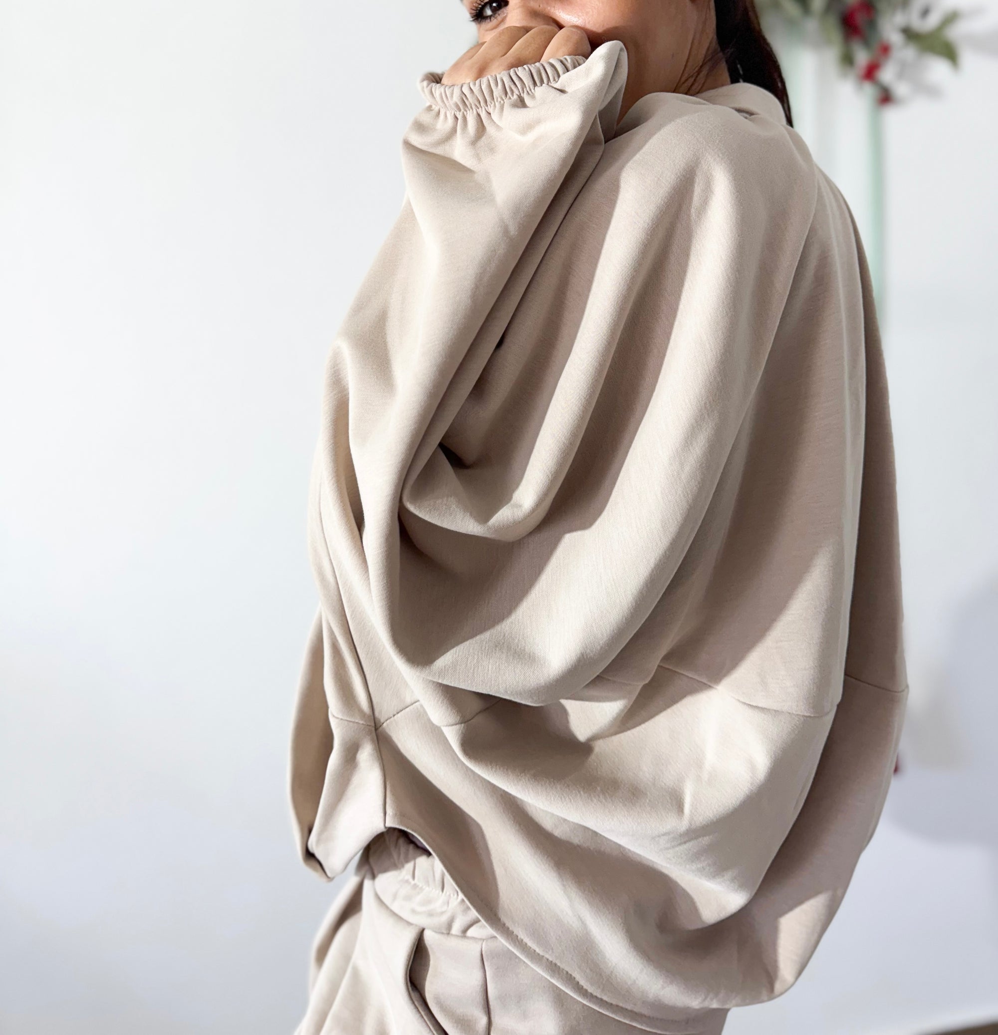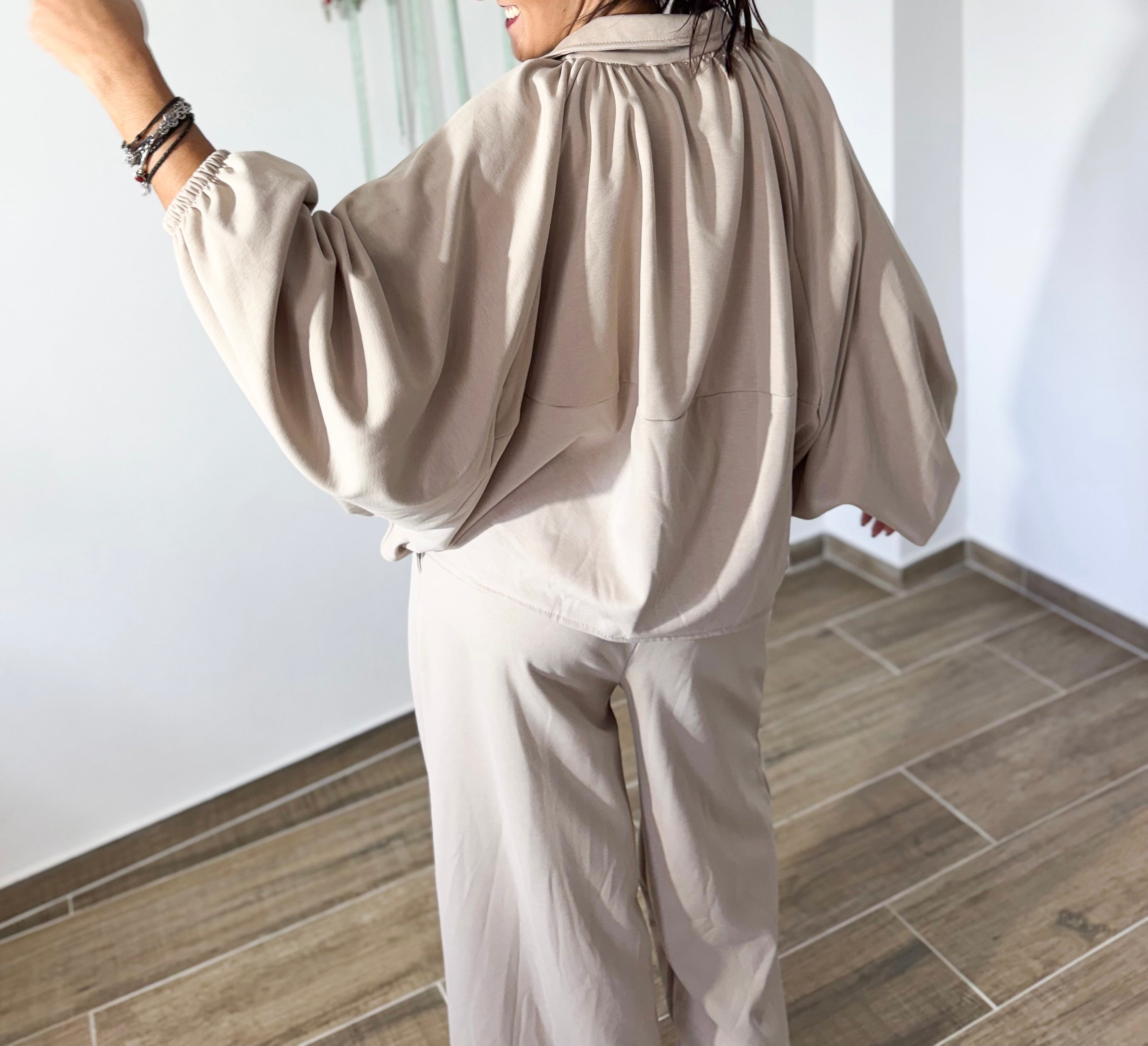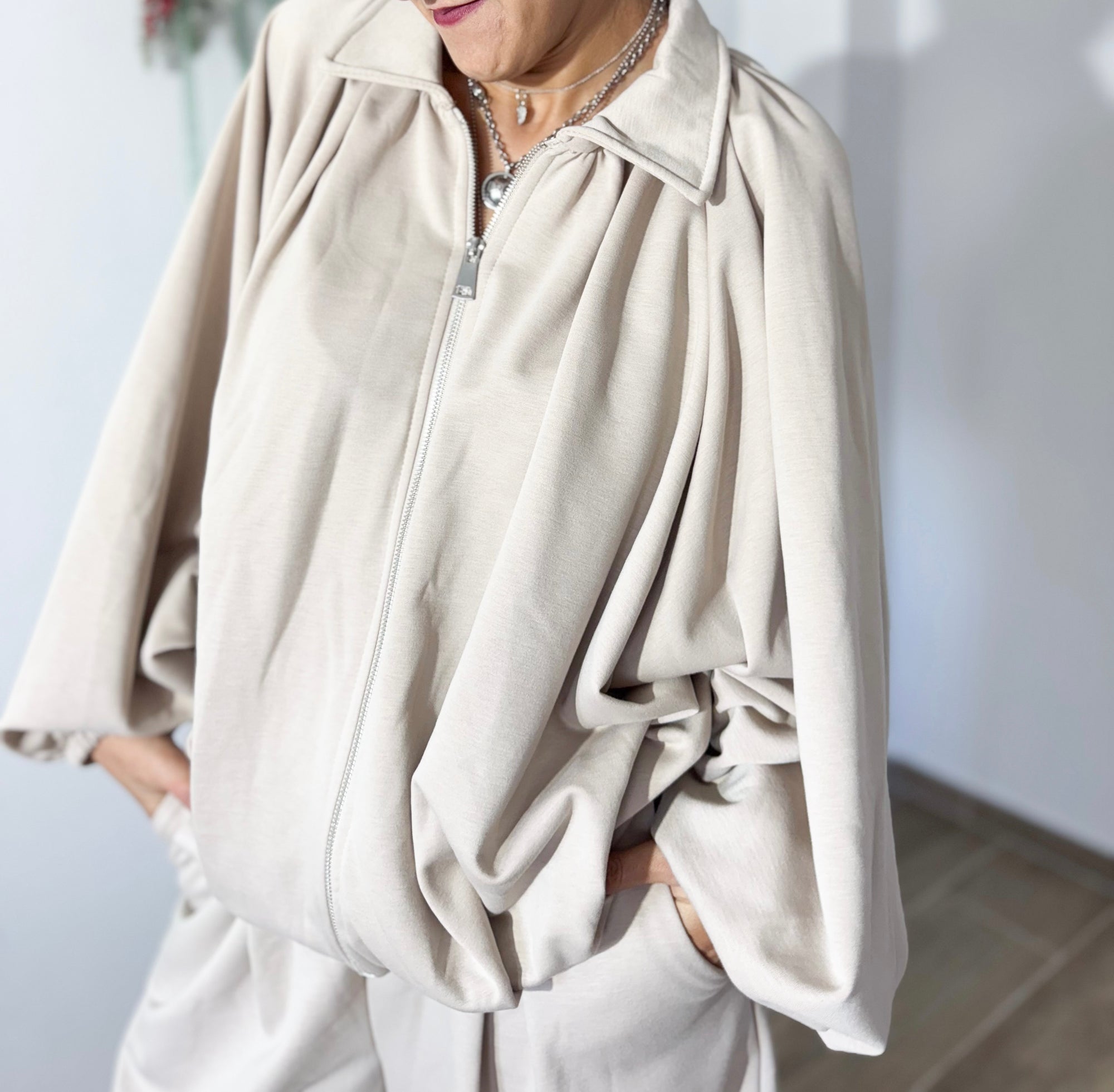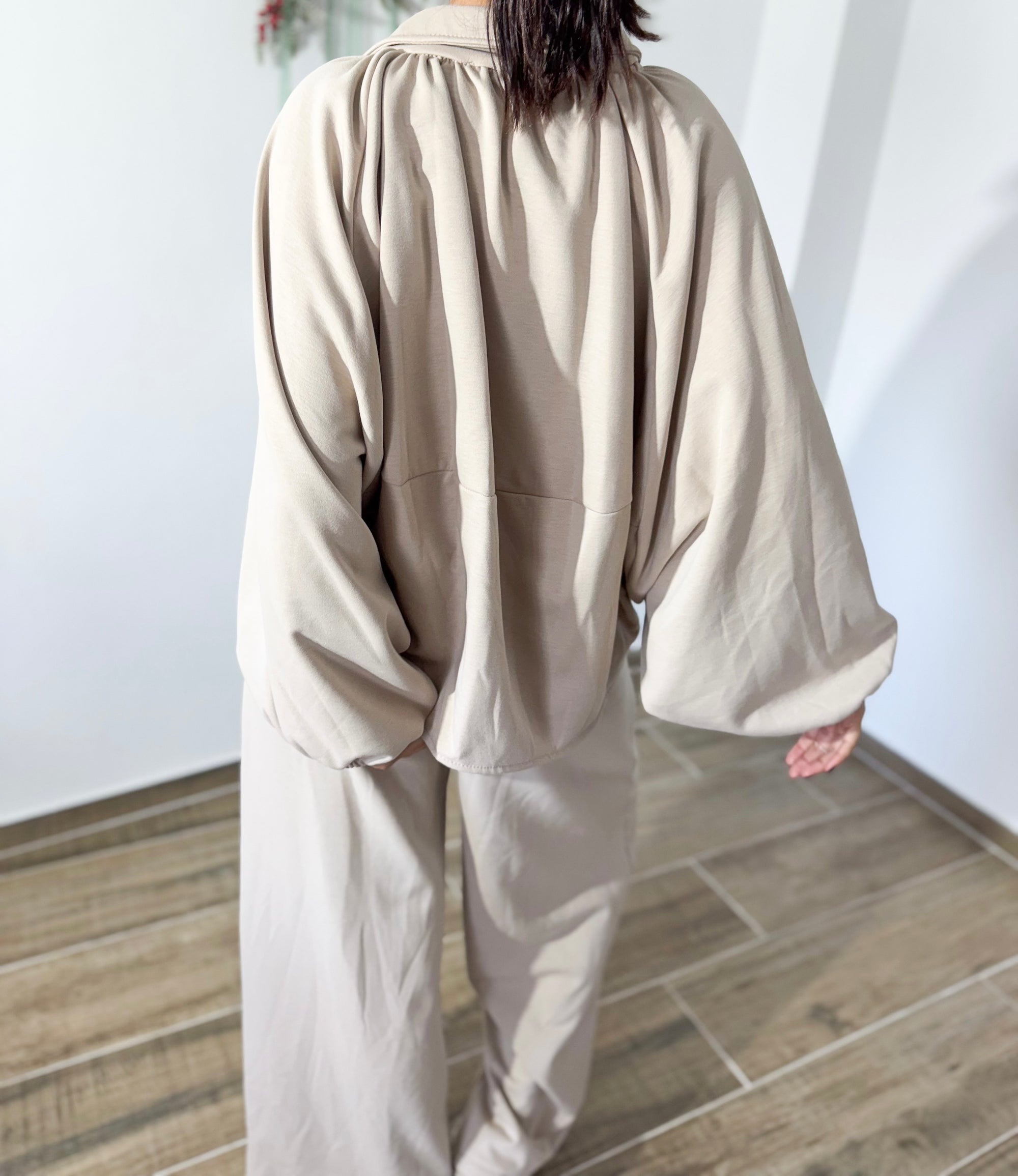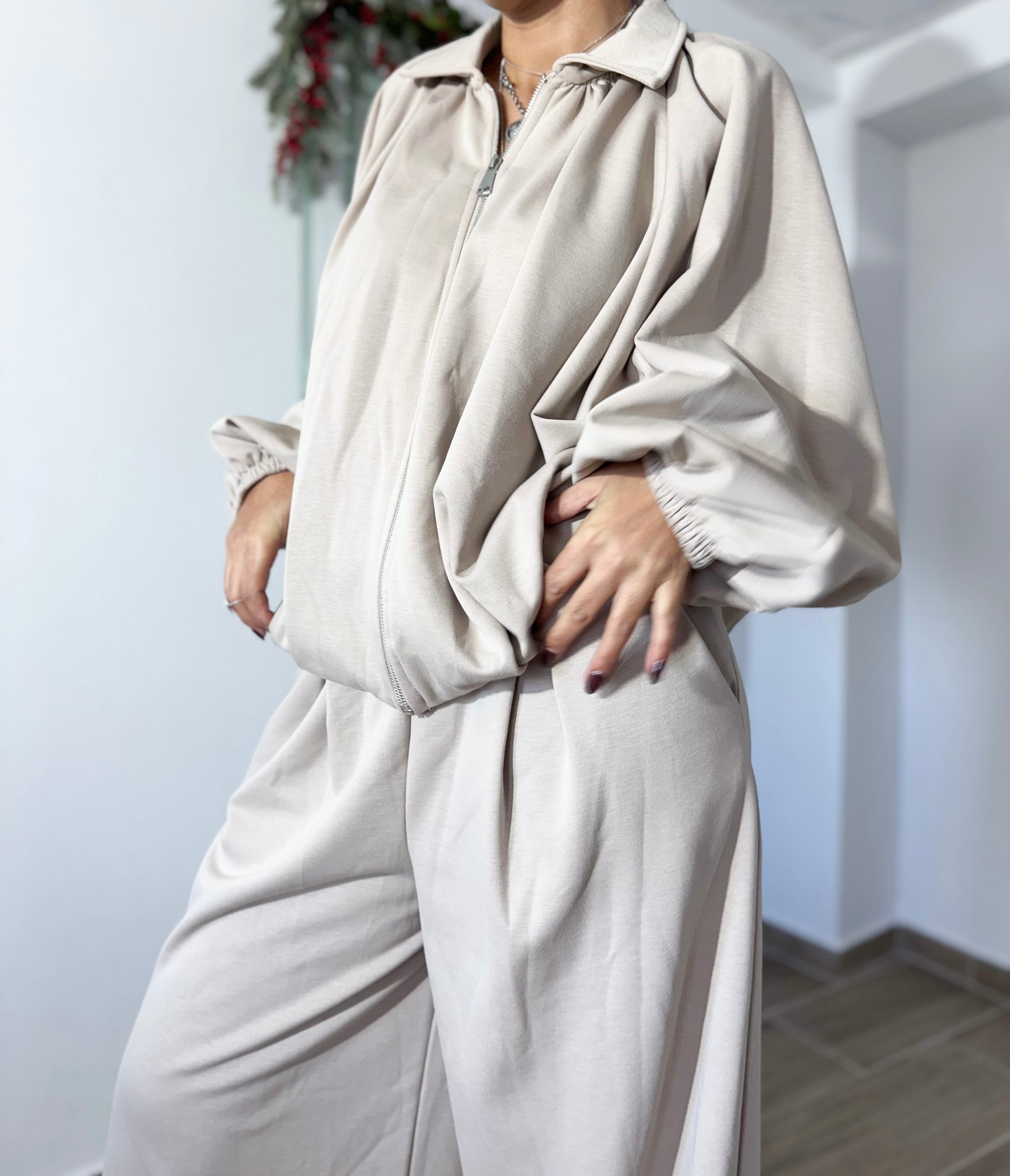 Casaco oversized com fecho, gola subida e mangas largas com elástico — super moderno e perfeito para usar aberto ou fechado. Calças de perna larga, fluídas e com cintura confortável, garantindo movimento e leveza.