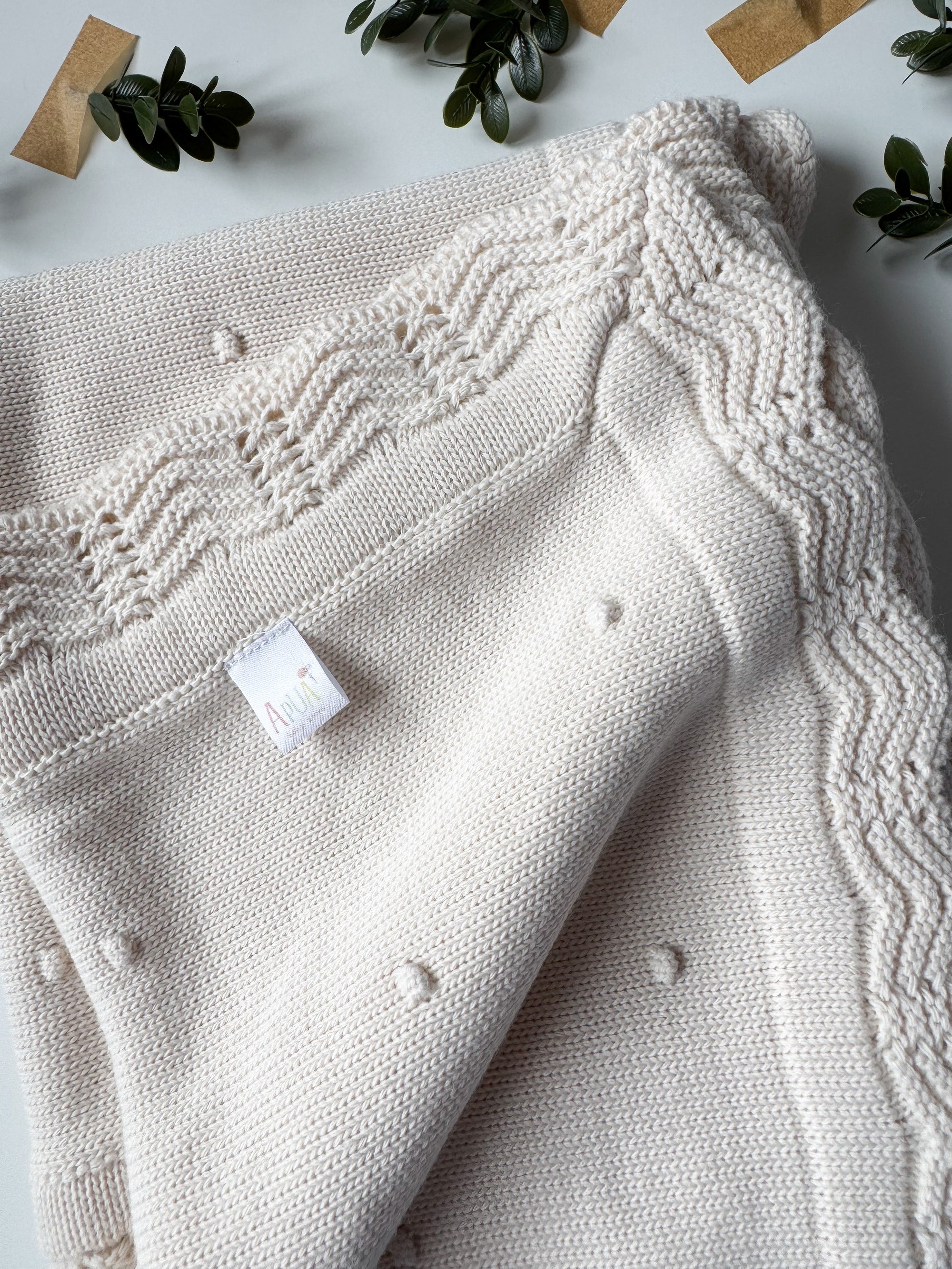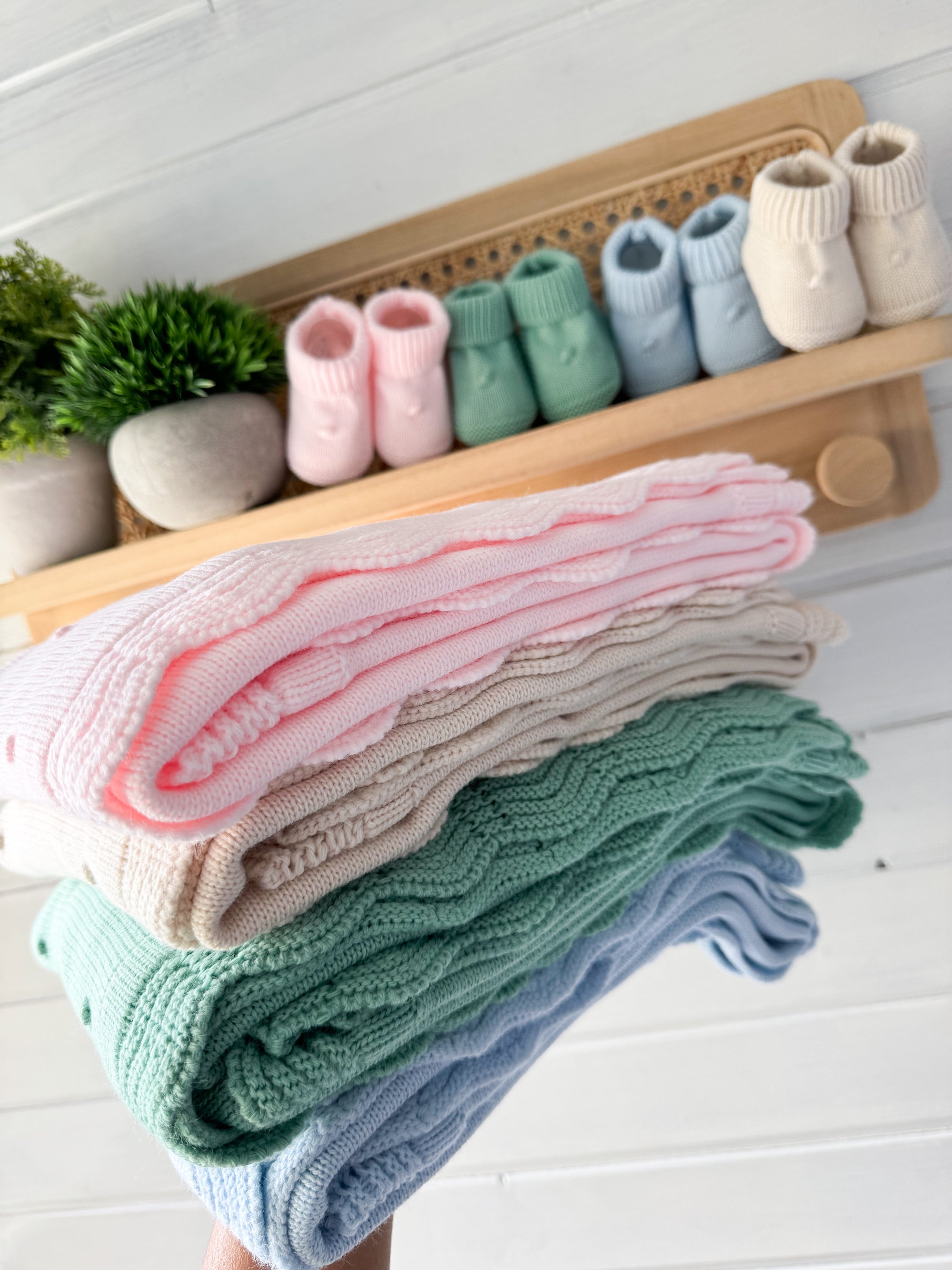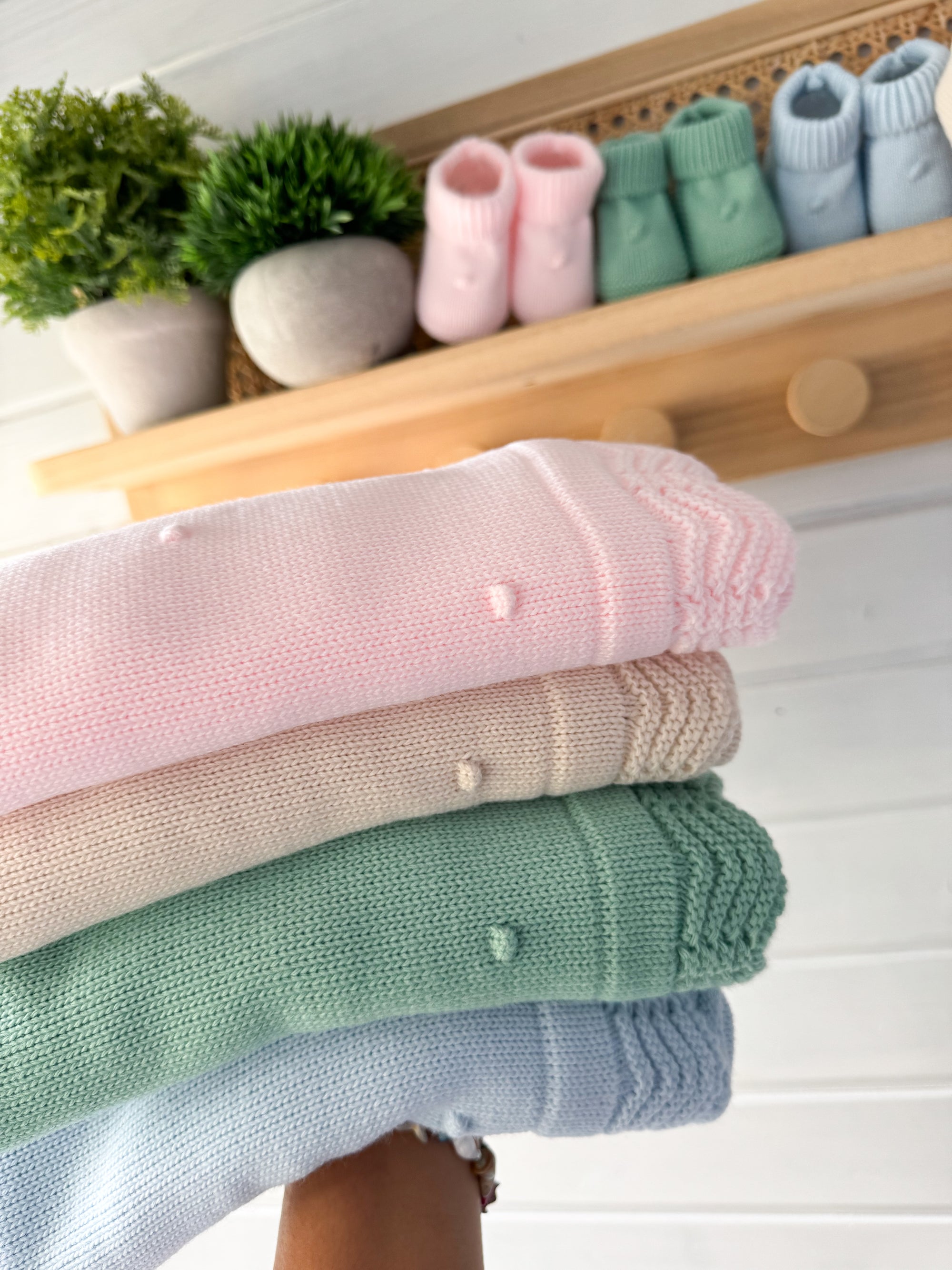 Delicada e aconchegante, a manta Apua foi pensada para envolver o recém-nascido em suavidade e conforto desde os primeiros dias. Produzida nacionalmente, destaca-se pelos detalhes em ponto canelado com relevo e pequenas aplicações em pipocas, que lhe conferem um charme especial.