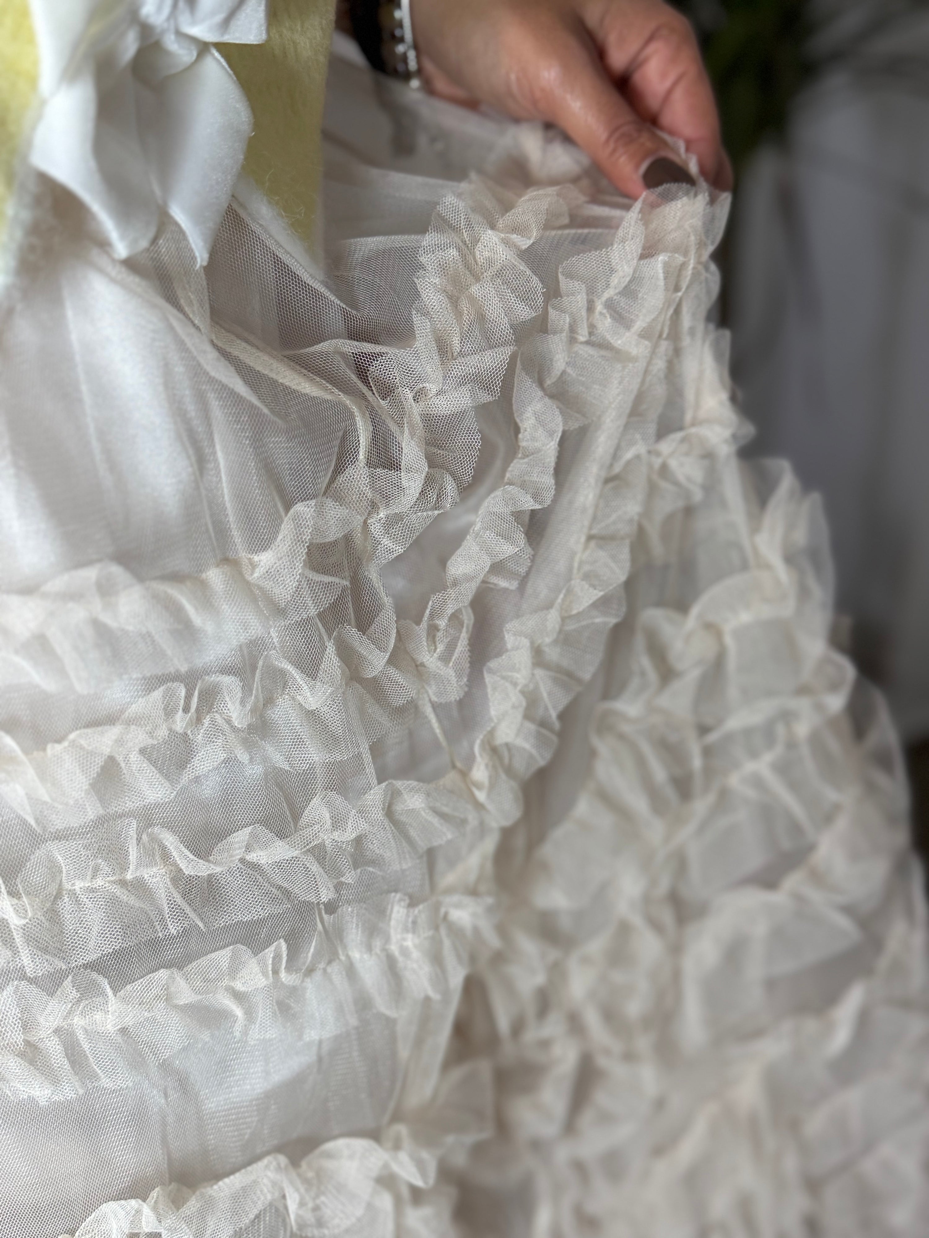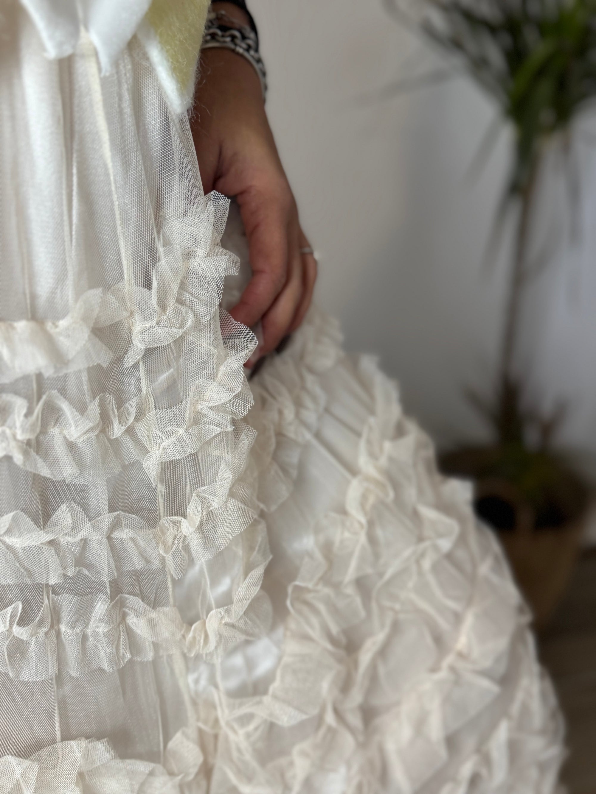 Saia comprida em tule, com folhos delicados que criam movimento e leveza. Um modelo romântico e feminino, ideal para elevar qualquer look.
