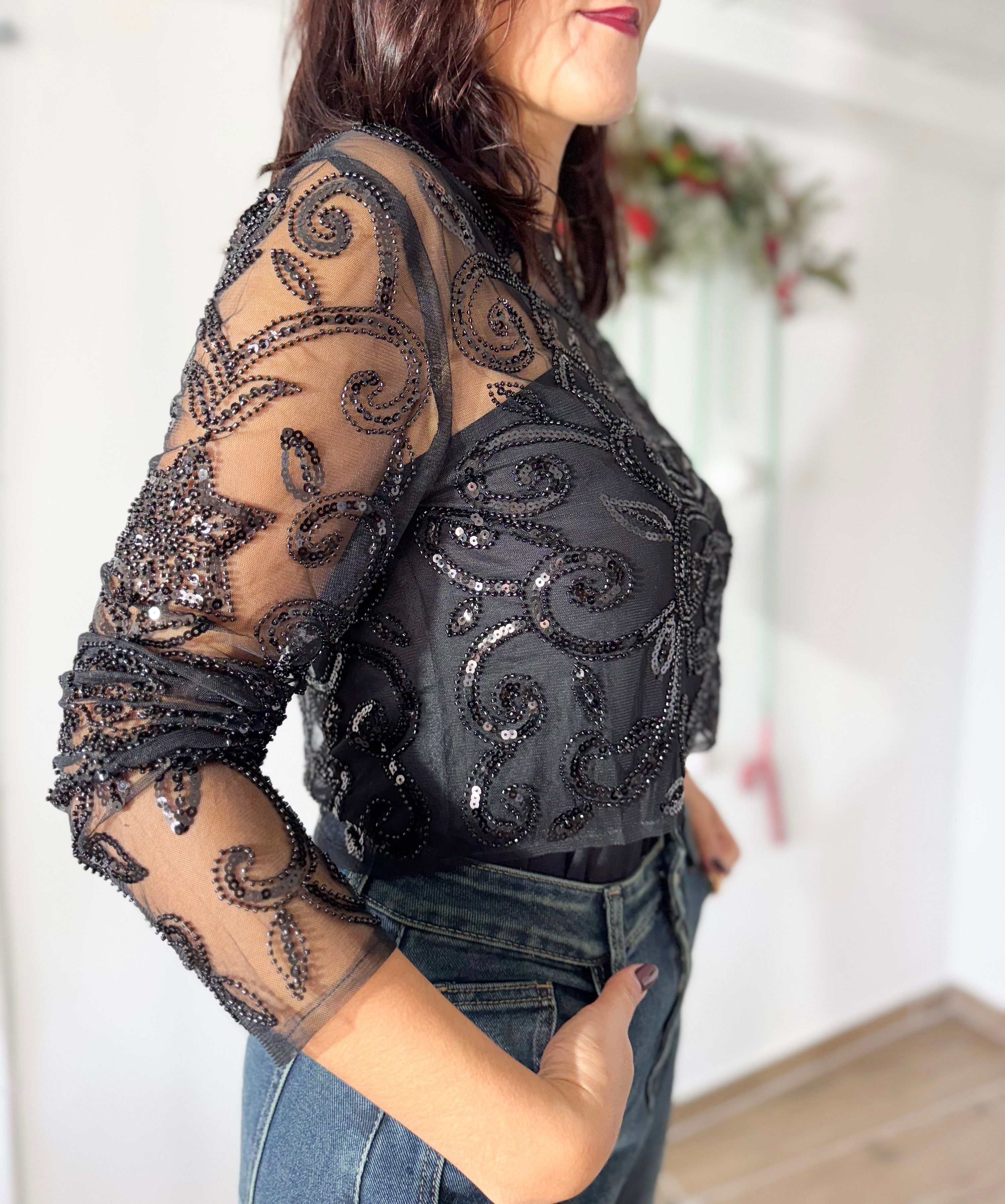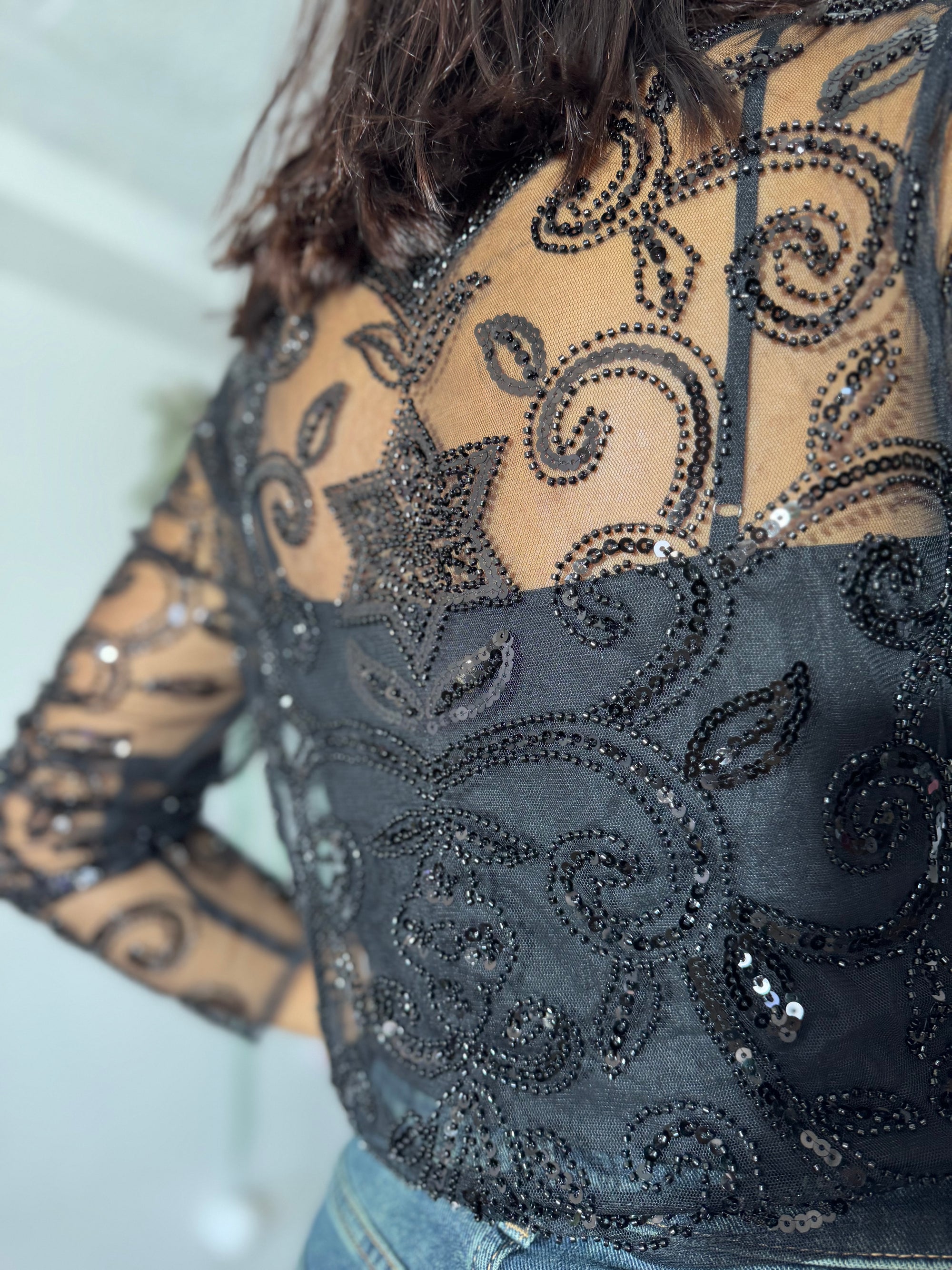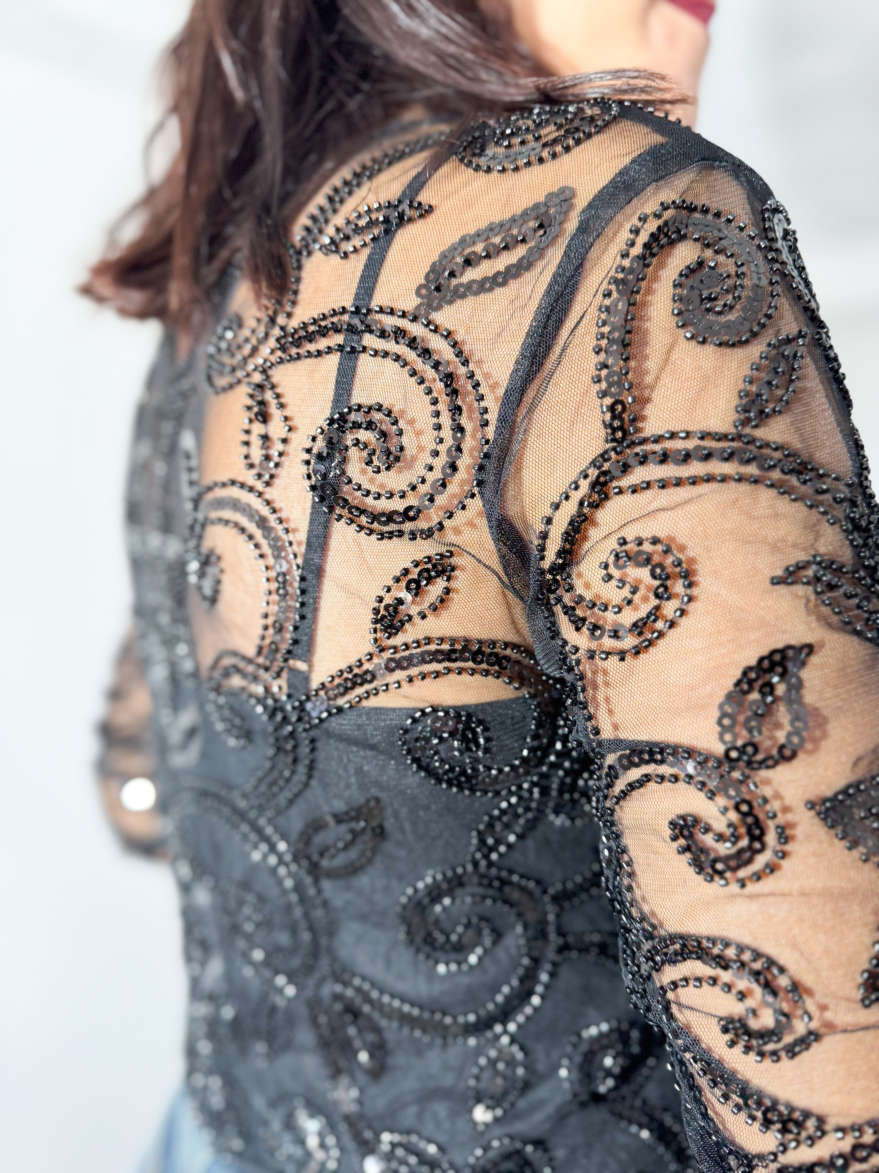 Blusa em tule preto, trabalhada com bordados e missangas em padrão ondulado, criando um efeito luxuoso e sofisticado. Mangas transparentes que dão leveza, brilho subtil e um toque moderno.