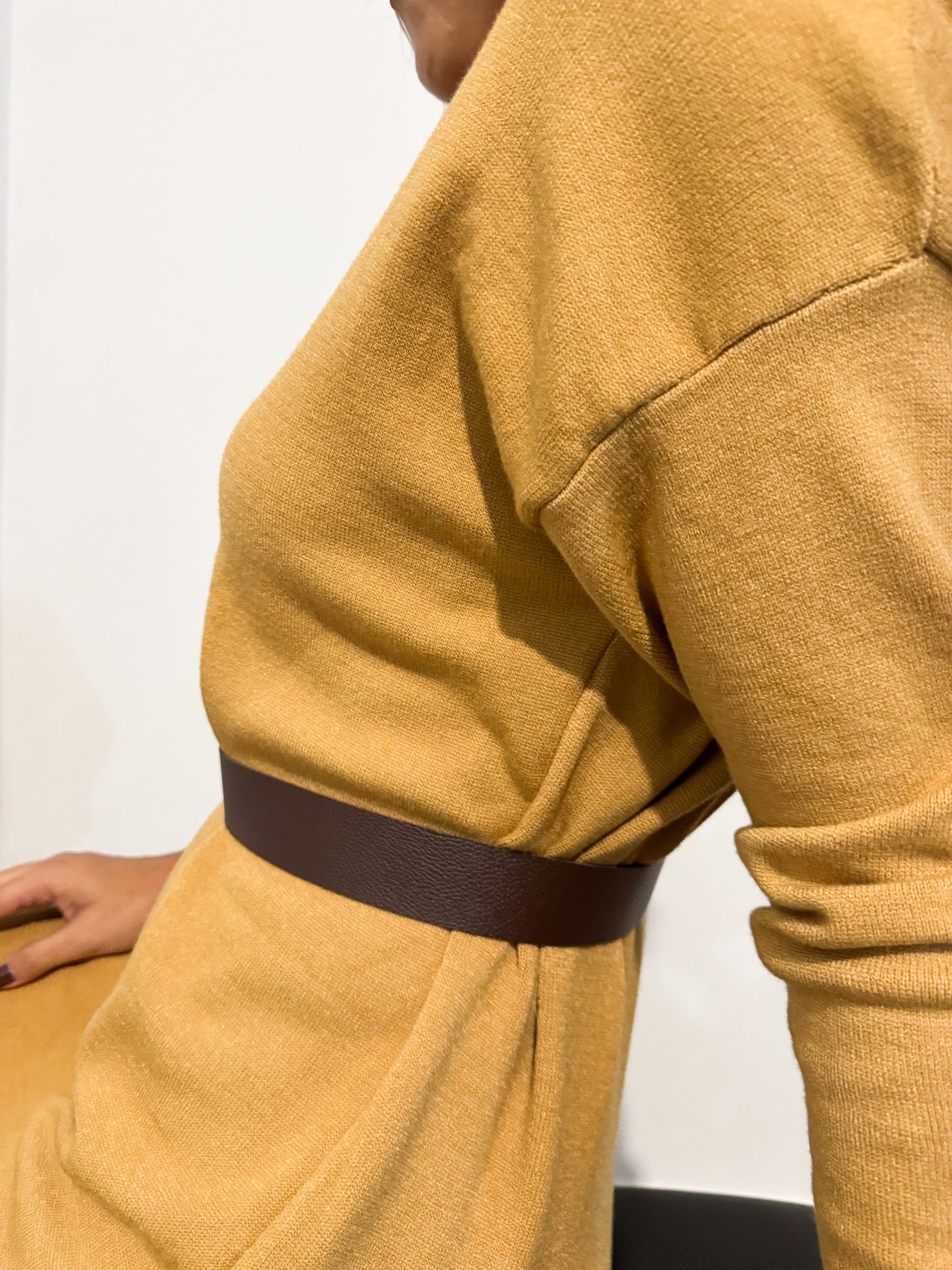 Um vestido de malha suave, em tom mostarda quente, criado para abraçar o corpo com conforto e elegância. O corte simples valoriza a silhueta, enquanto o cinto marca delicadamente a cintura, criando um visual feminino e moderno. Perfeito para o dia a dia, para trabalhar ou para um jantar descontraído — uma peça versátil que combina estilo, praticidade e o toque acolhedor.